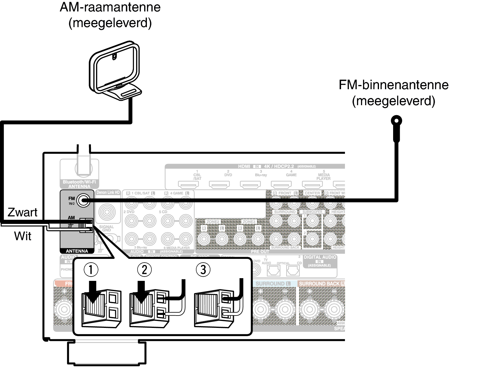 Sluit de antenne aan, stem af op een uitzending en verplaats dan de antenne naar de locatie waar er het minste ruis is. Gebruik dan tape, enz. om de antenne te bevestigen op deze locatie. (Luisteren naar FM/AM-uitzendingenkoppeling)