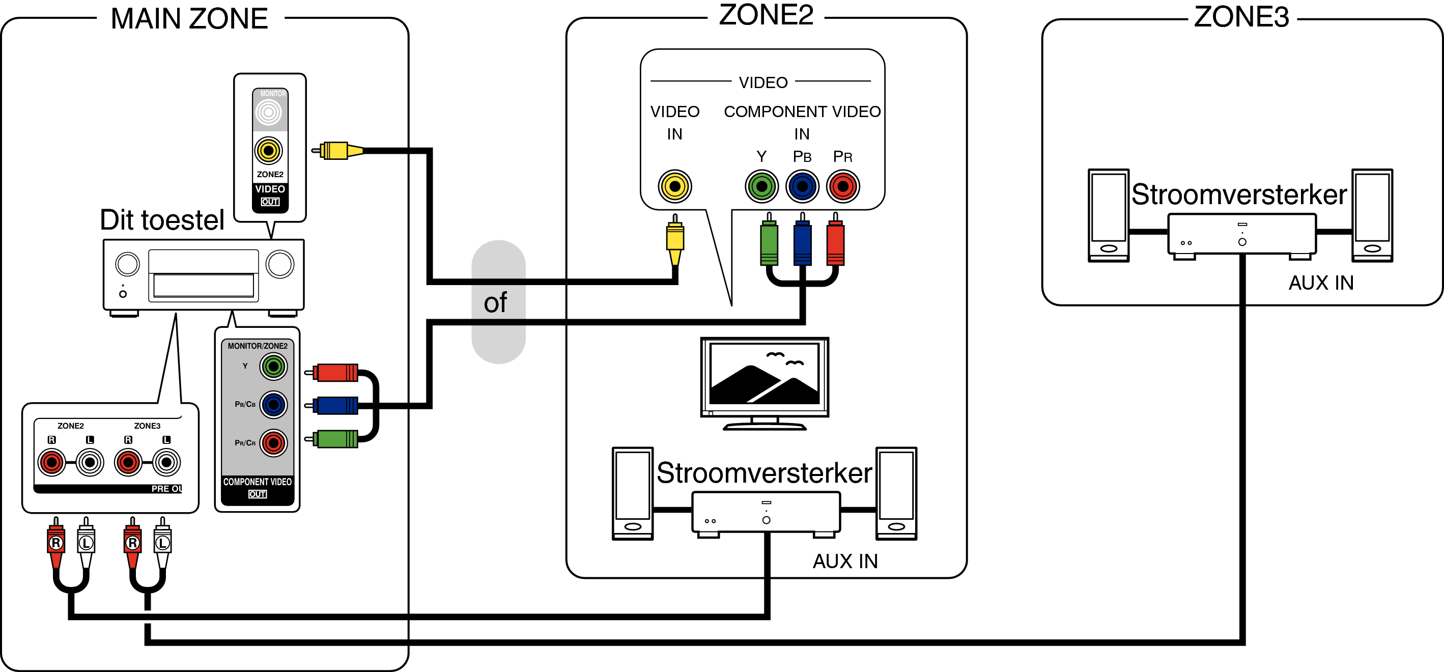 De audiosignalen van de ZONE2- en ZONE3-audio-uitgangen van dit toestel worden uitgevoerd naar de ZONE2- en ZONE3-versterkers en afgespeeld via deze versterkers.