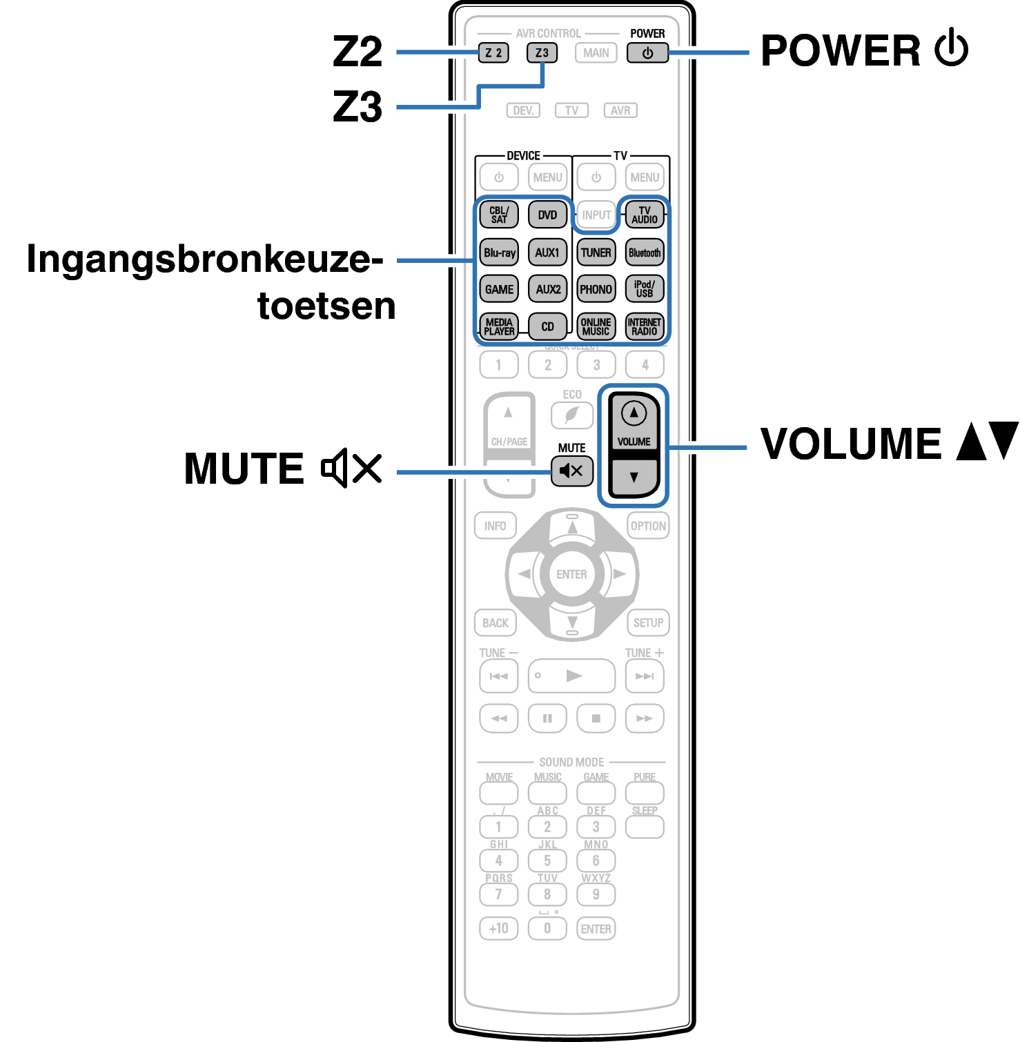 Voor het uitvoeren van een bediening met het hoofdtoestel, moet u herhaaldelijk op ZONE2 SOURCE of ZONE3 SOURCE drukken. Telkens wanneer u op ZONE2 SOURCE of ZONE3 SOURCE drukt, verandert de ingangsbron.