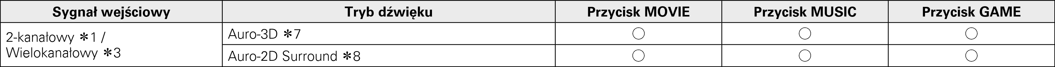 W tym trybie jest wykrywany typ cyfrowego sygnału wejściowego, taki jak Dolby Digital, Dolby TrueHD, Dolby Digital Plus, Dolby Digital EX, Dolby Atmos, DTS, DTS-HD, DTS:X, DTS-ES, PCM (wielokanałowy), a odpowiedni tryb odtwarzania jest wybierany automatycznie. |