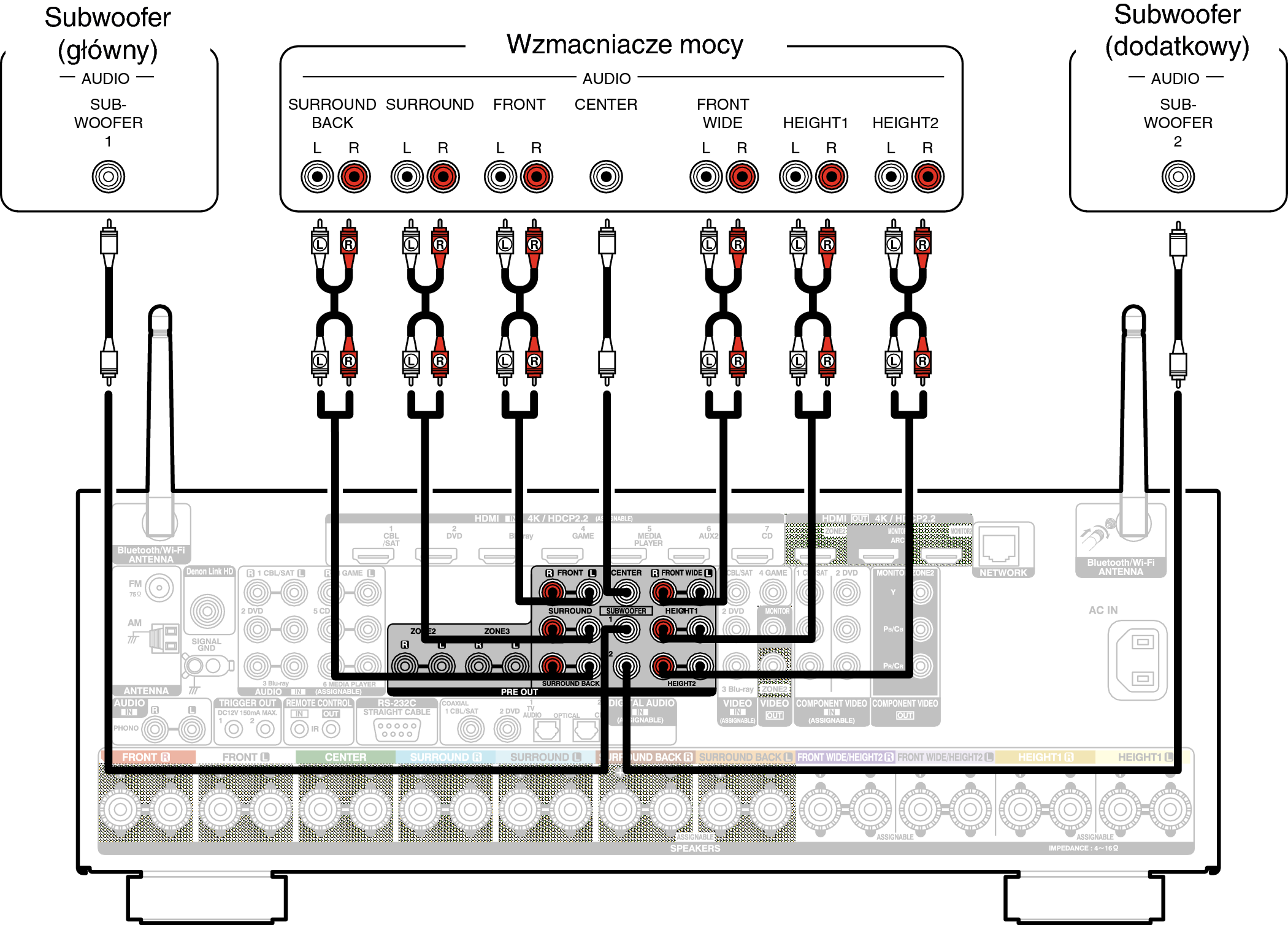 Przykładowe połączenie w przypadku używania głośników tylnych surround i przednich szerokich