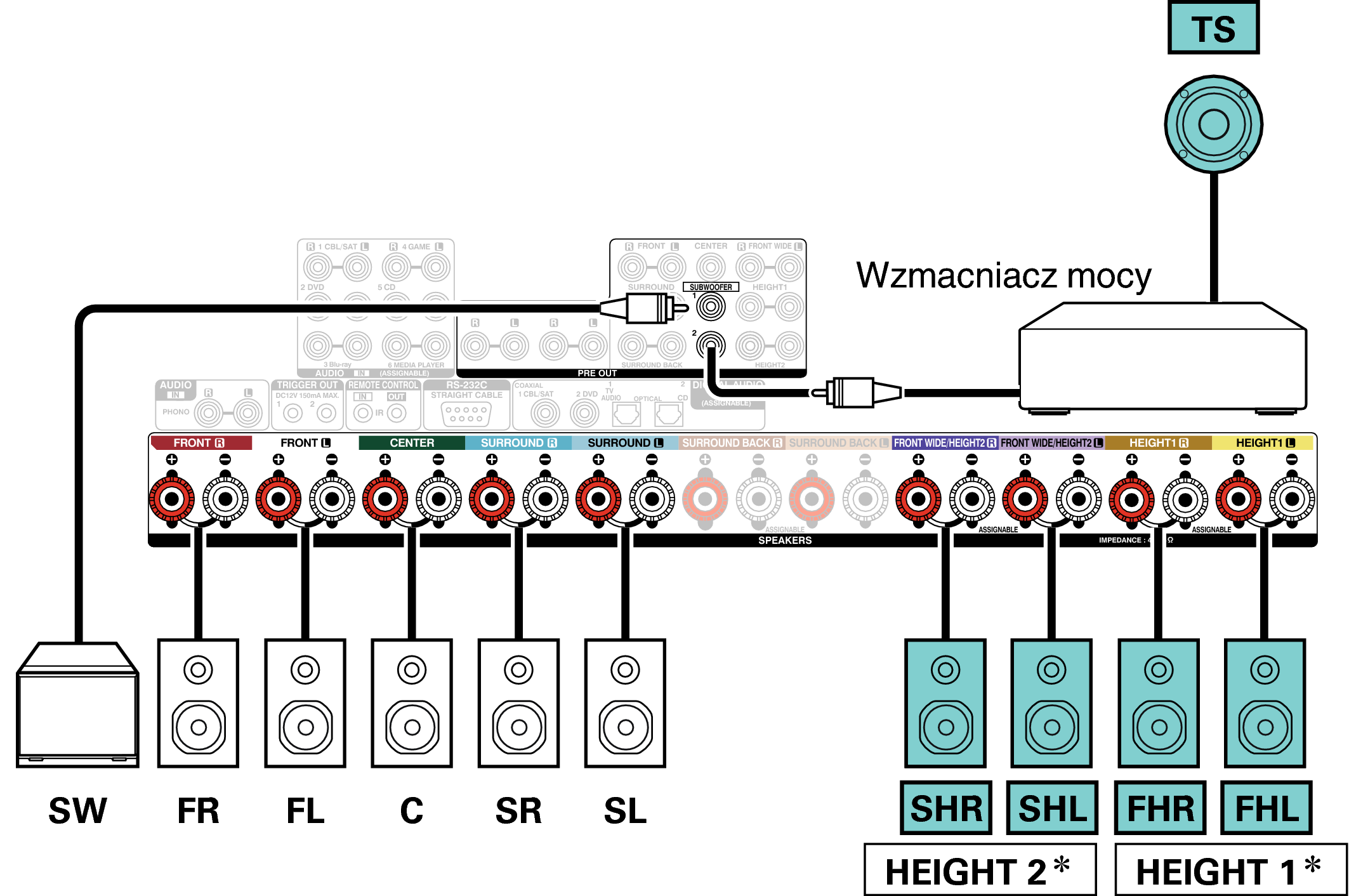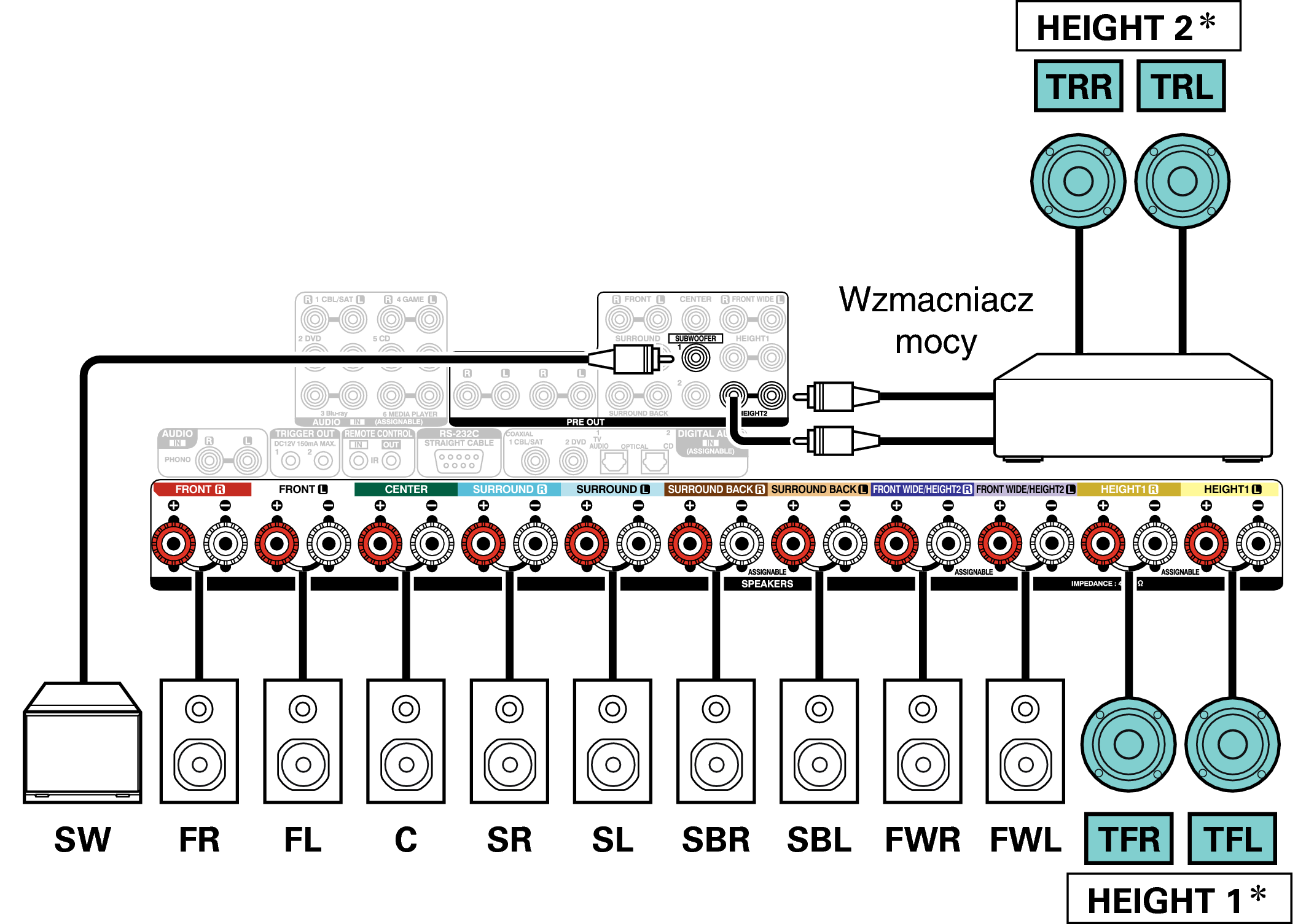 Zamiast głośników p. górnych można podłączyć głośniki tylne ścienne. W takim przypadku ustaw podłączane głośniki górne w “Wysokość” - “układ” w menu. link
