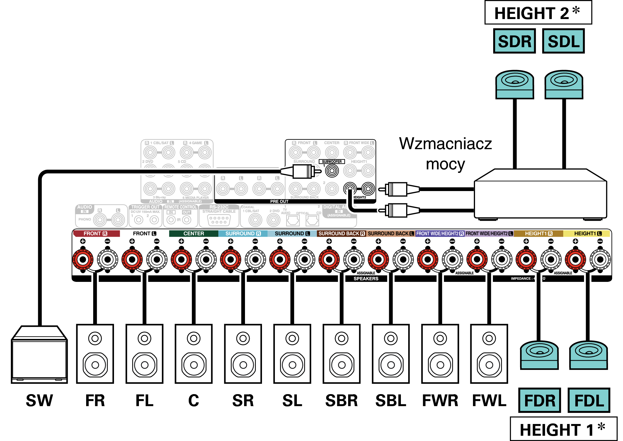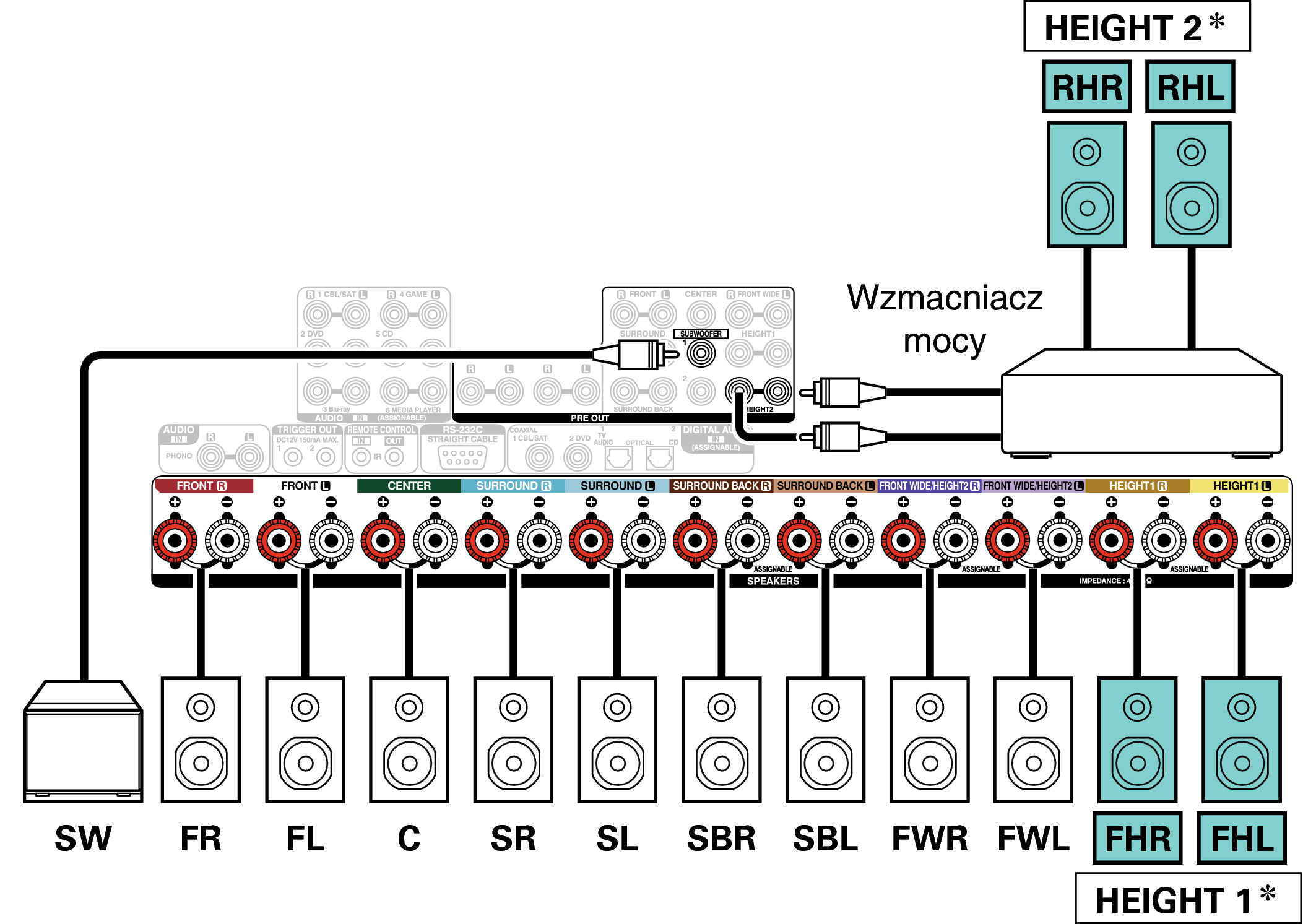 Do zacisków głośnikowych HEIGHT1 można podłączyć głośniki górne, głośniki sufitowe i głośniki Dolby Atmos Enabled. Ustaw podłączany głośnik w “Wysokość” - “układ” w menu. link