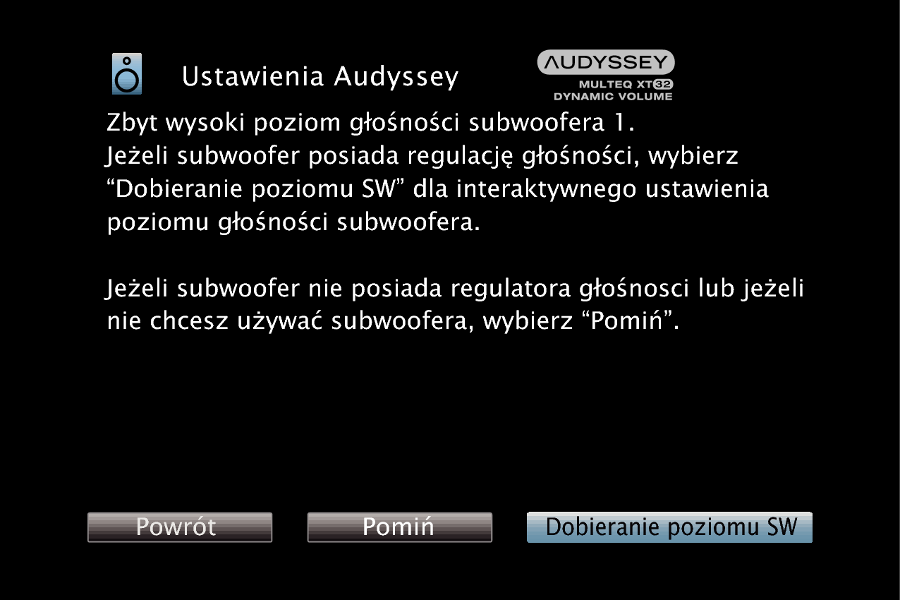 Jeżeli procedura Ustawienia Audyssey® nie może zostać zakończona z powodu umieszczenia głośników, środowiska pomiarowego itp., wyświetlony zostaje komunikat błędu. W takim wypadku należy sprawdzić odpowiednie pozycje i wykonać niezbędne czynności. Pamiętaj o wyłączeniu zasilania przed sprawdzeniem poprawności podłączeń.
