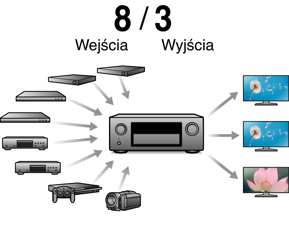 Złącza HDMI umożliwiają podłączenie różnorodnych źródeł cyfrowych AV (8 wejść, 3 wyjścia)