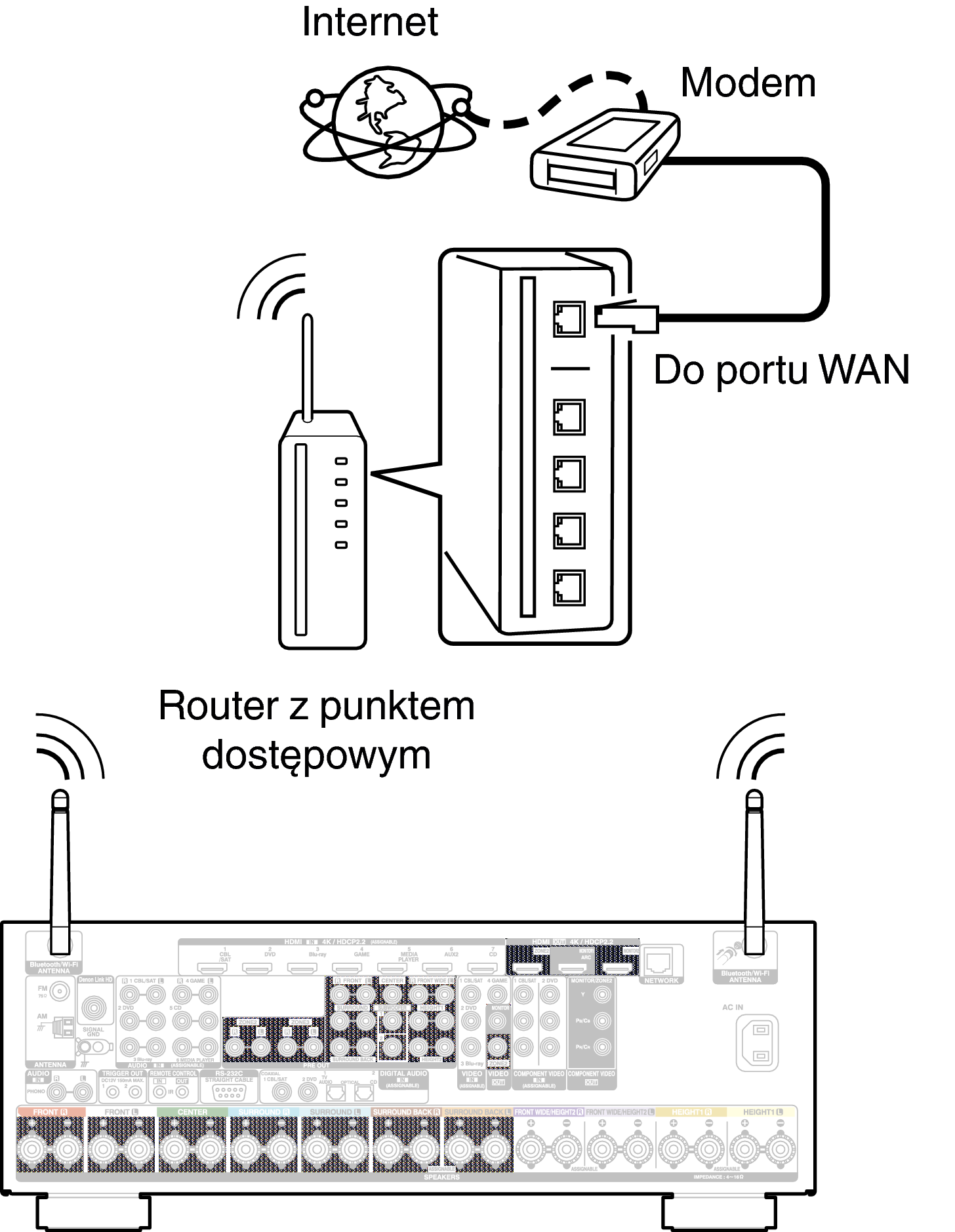 W przypadku podłączenia amplitunera do sieci bez funkcji DHCP, skonfiguruj adres IP itd., w “Sieć”. link