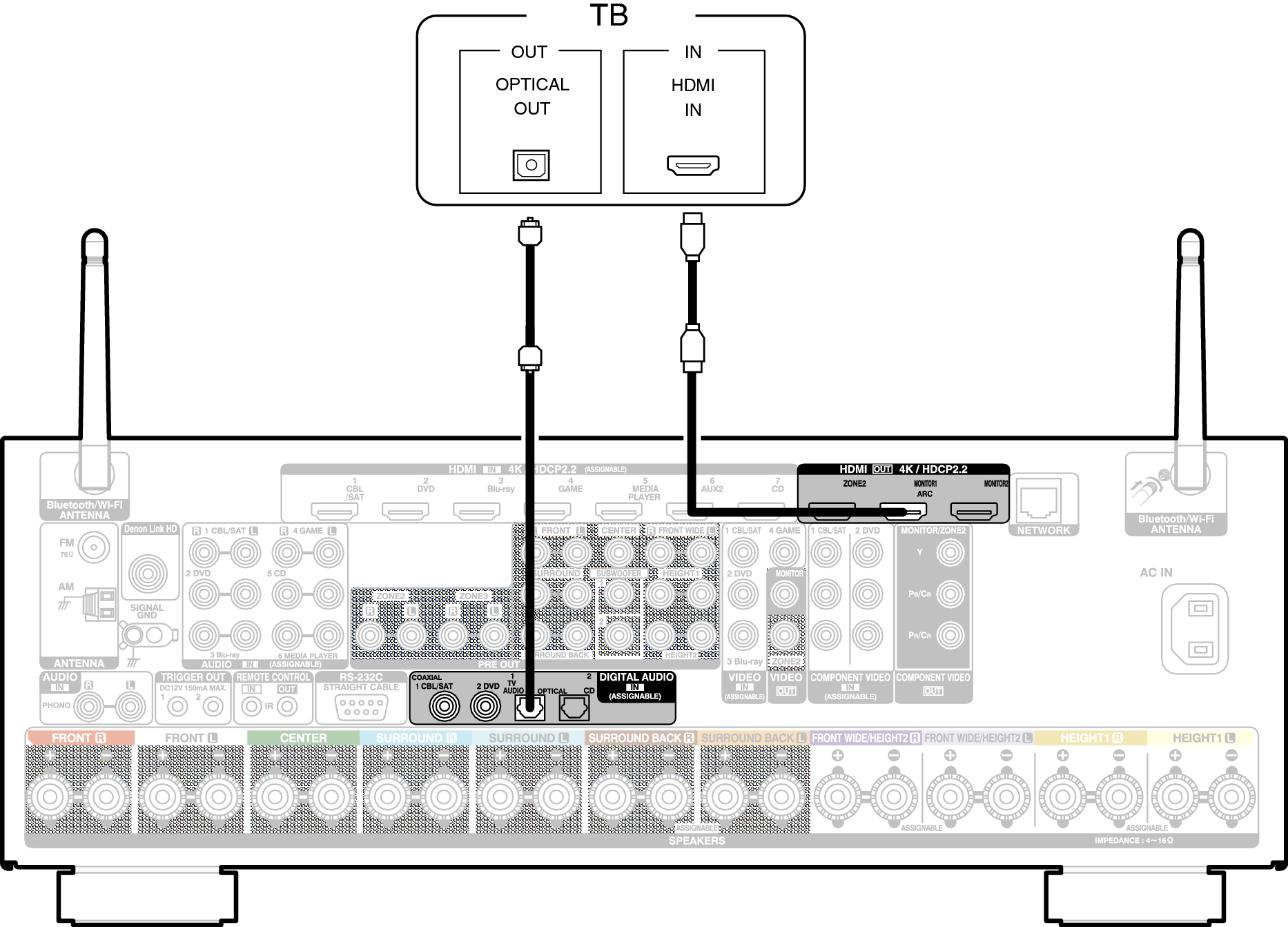 Для прослушивания звука с телевизора соедините оба устройства оптическим кабелем.