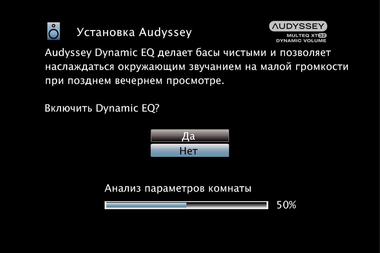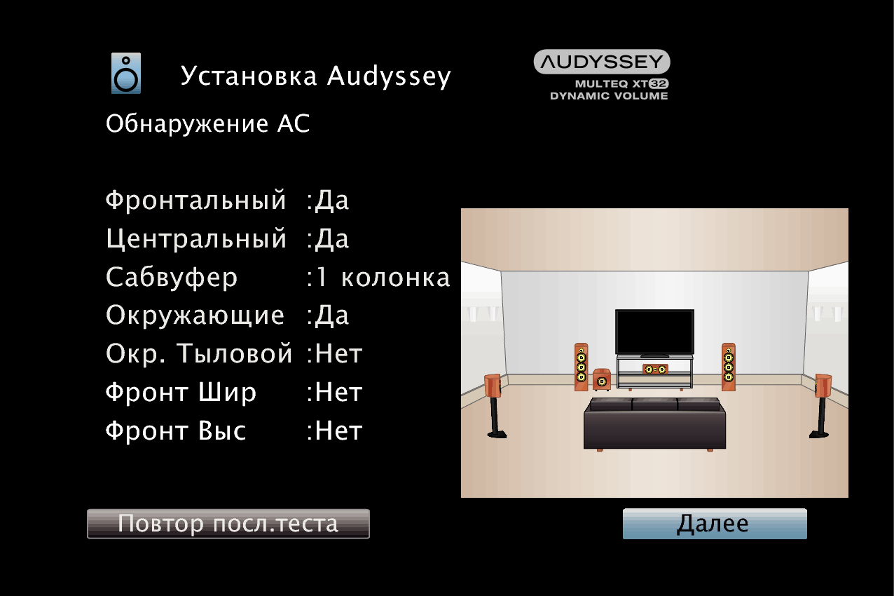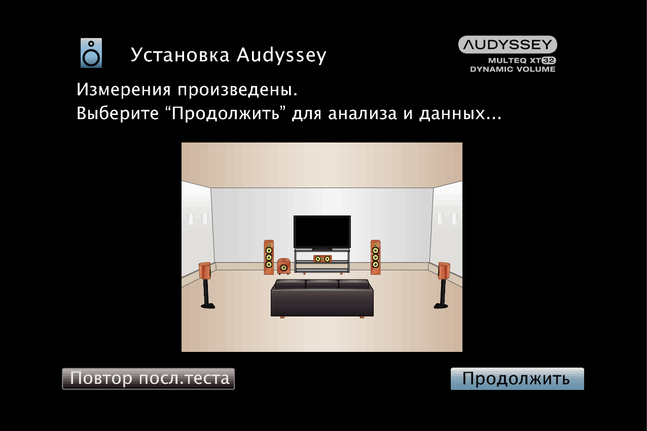 Не изменяйте соединение динамика или громкость сабвуфера после настройки Audyssey®. Если их изменили, запустите настройку Audyssey® снова для того, чтобы сконфигурировать оптимальные настройки эквалайзера.