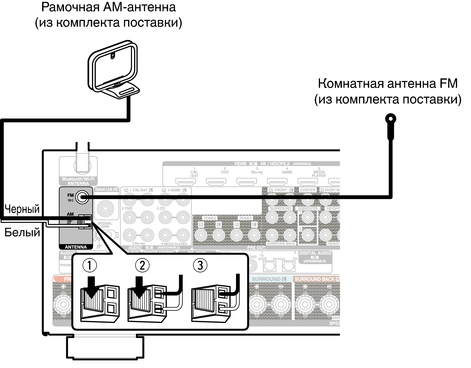 Подключите антенну, настройте ее на радиостанцию, а затем переместите антенну в место, где меньше всего шума. Затем используйте ленту и т.д., чтобы закрепить антенну в данном положении. (Прослушивание FM/AM-радиостанцийссылка)