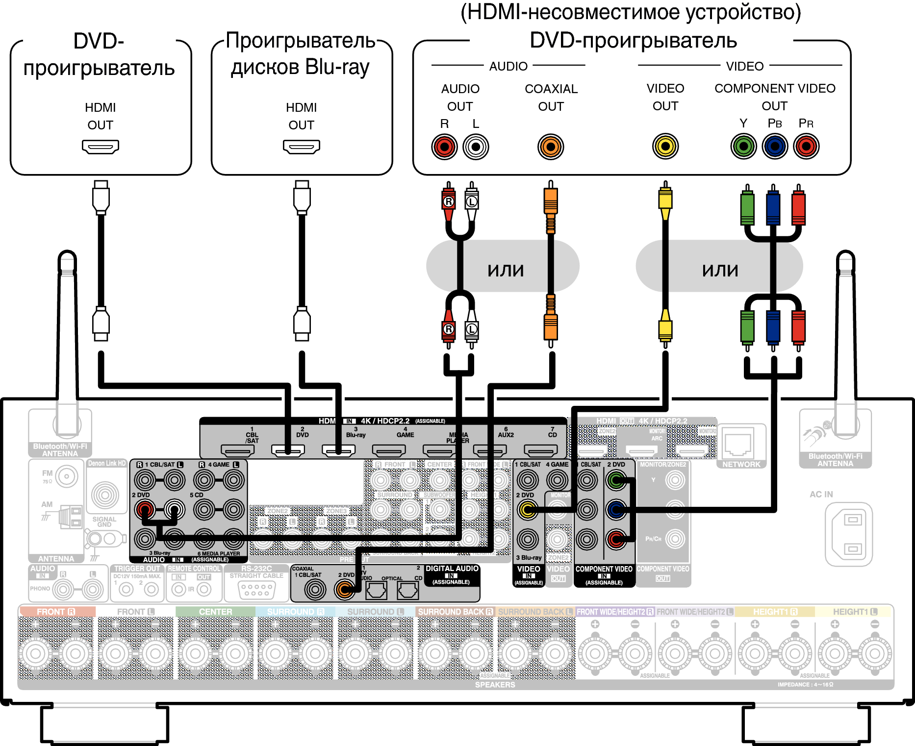 При подключении проигрывателя дисков Blu-ray, совместимого с Denon Link HD, см. раздел “Подключение проигрывателя дисков Blu-ray, совместимого с функцией Denon Link HD”ссылка.