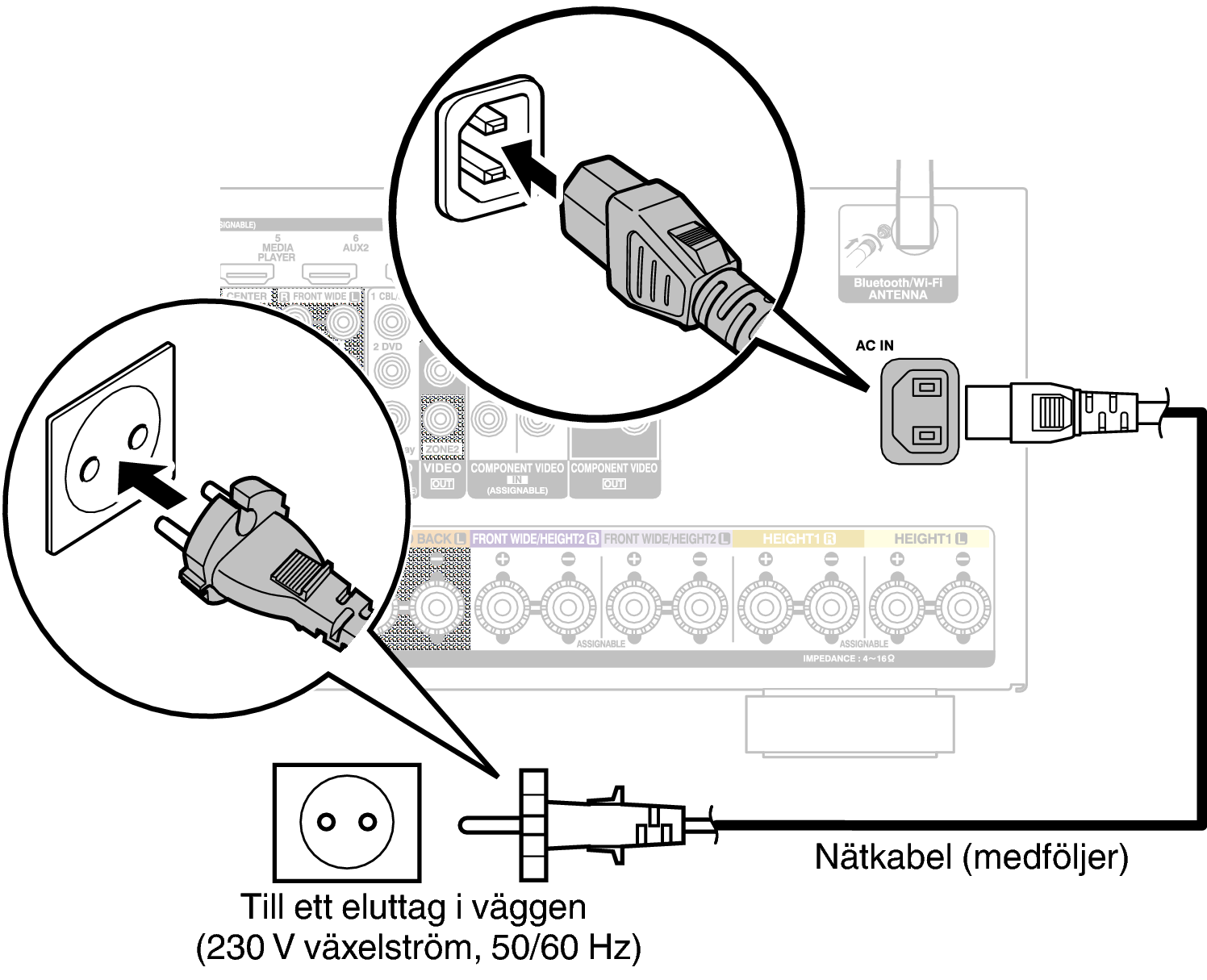 Anslut nätkabeln till ett vägguttag när alla anslutningar är klara.