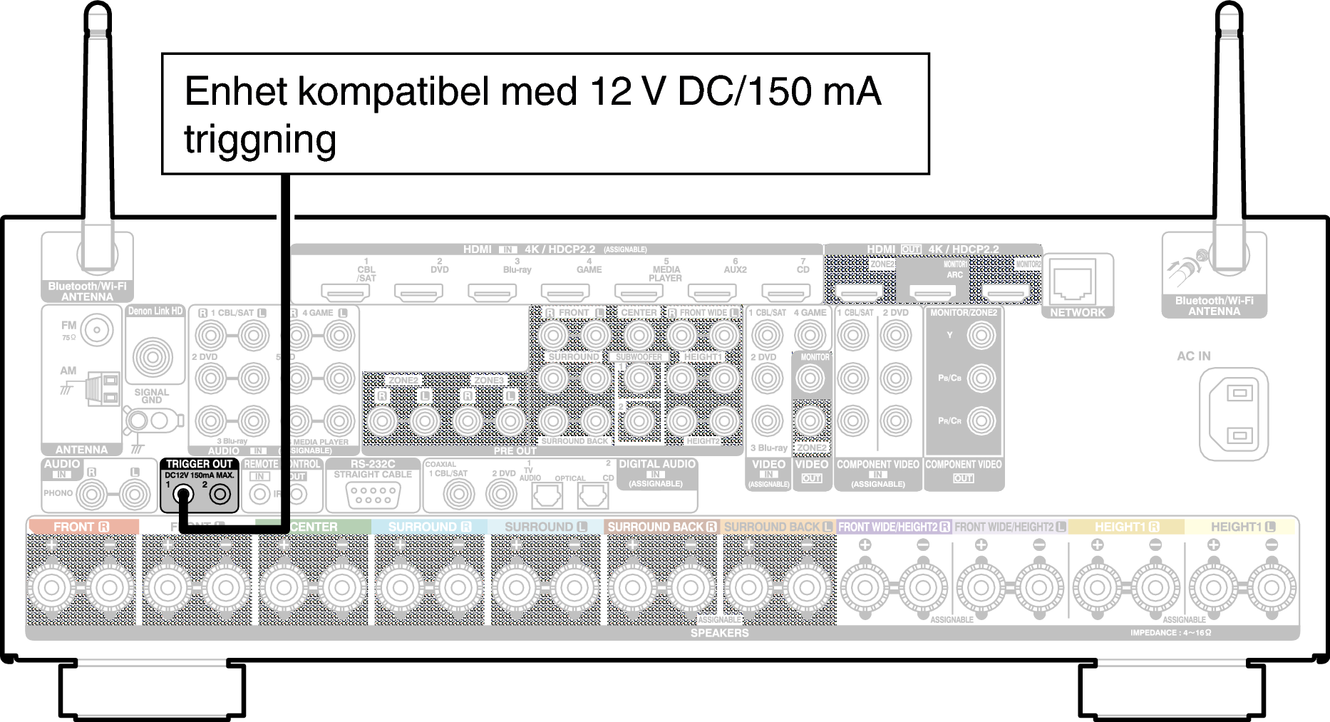 När du ansluter en enhet med TRIGGER IN-anslutning kan du slå på eller sätta enheten i standbyläge via länkad styrning från den här enheten.