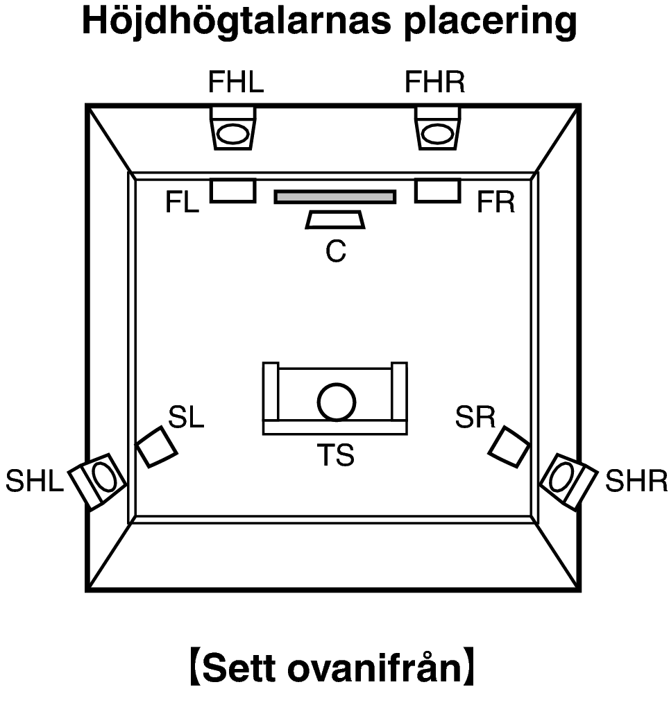 Placera vänster och höger FRONT HEIGHT-högtalare precis ovanför fronthögtalarna. Montera dem så nära taket som möjligt och rikta dem mot den primära avlyssningspositionen.