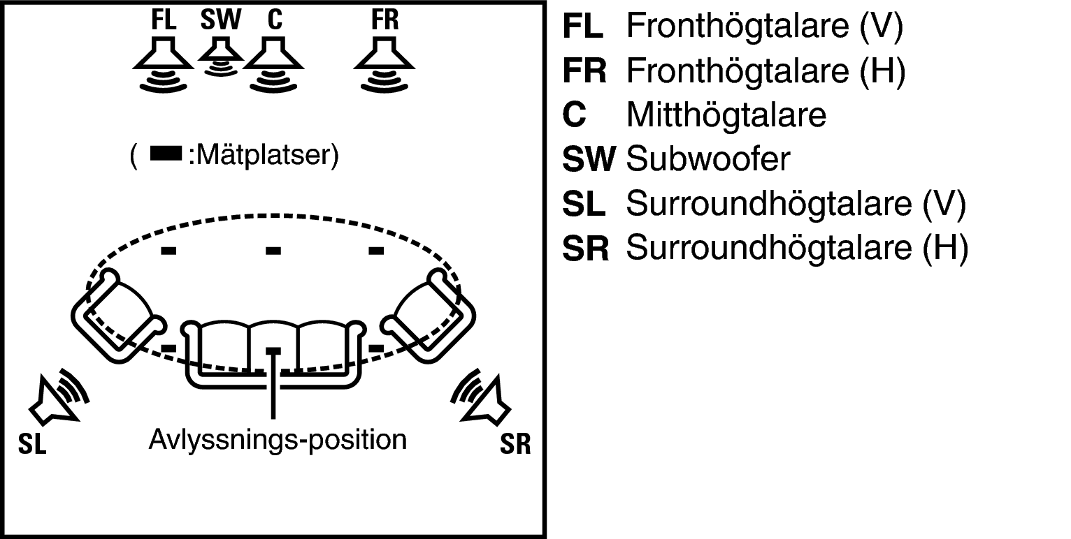 Audyssey MultEQ® XT32 använder mätningar från den här positionen för att räkna ut högtalaravstånd, nivå, polaritet och den optimala delningsfrekvensen för subwoofern.
