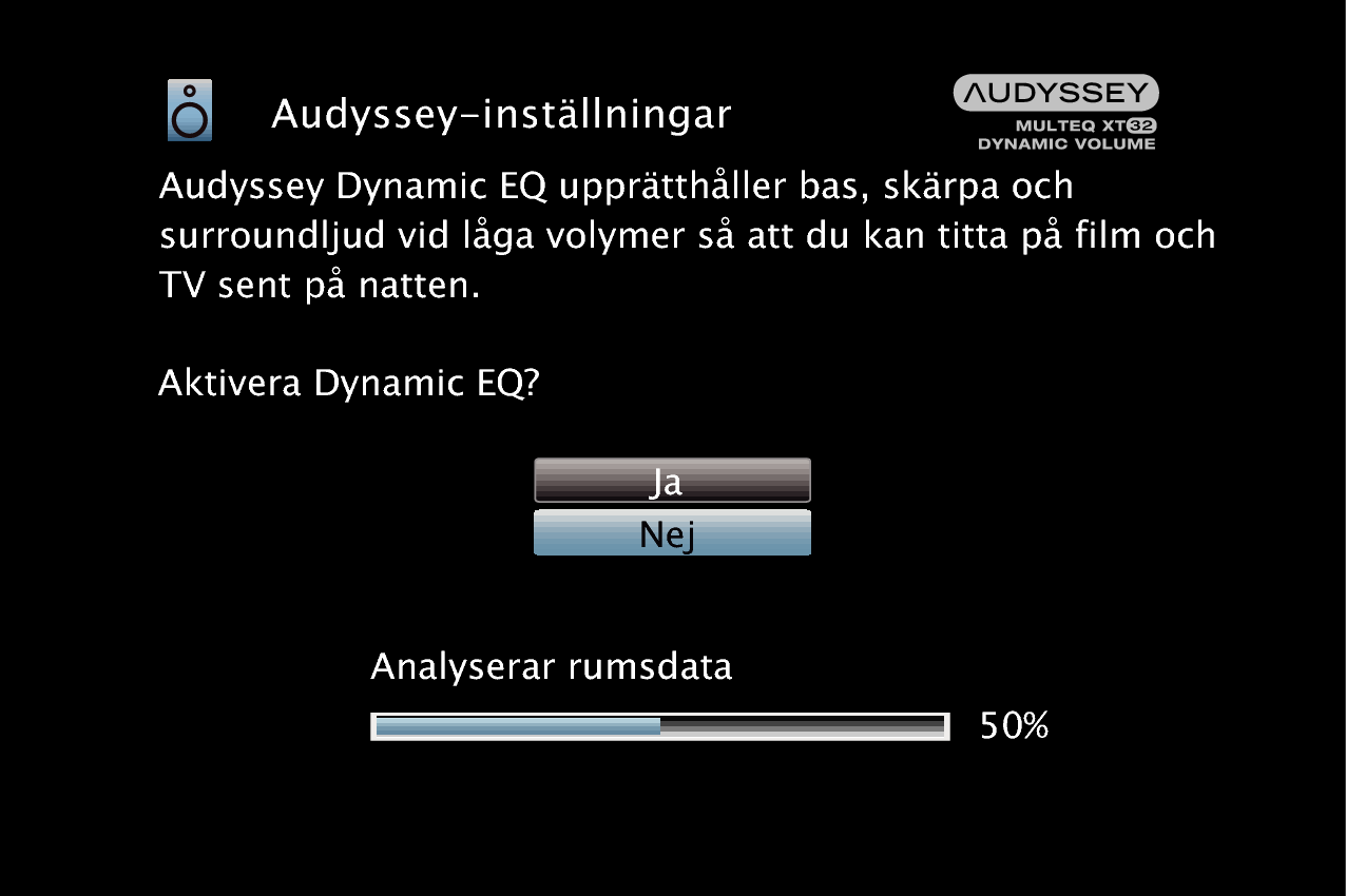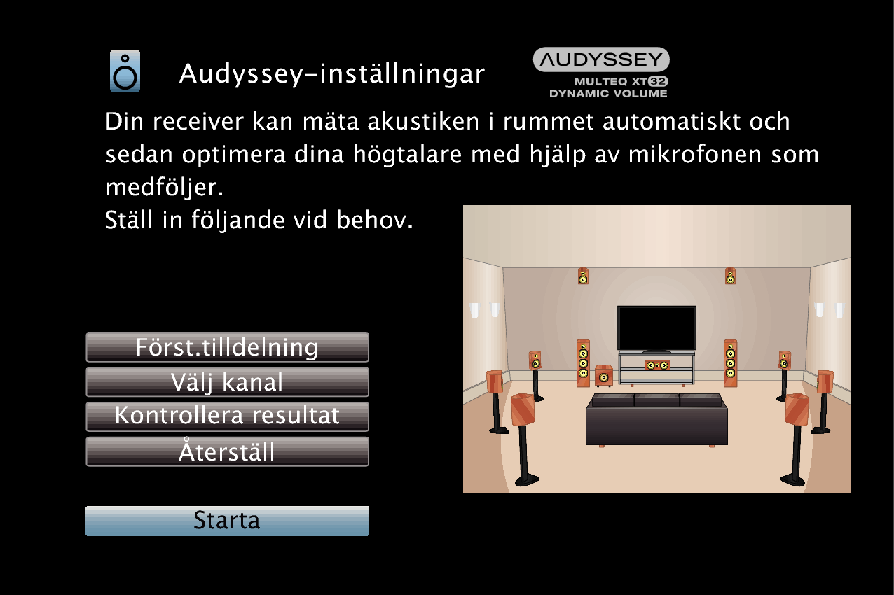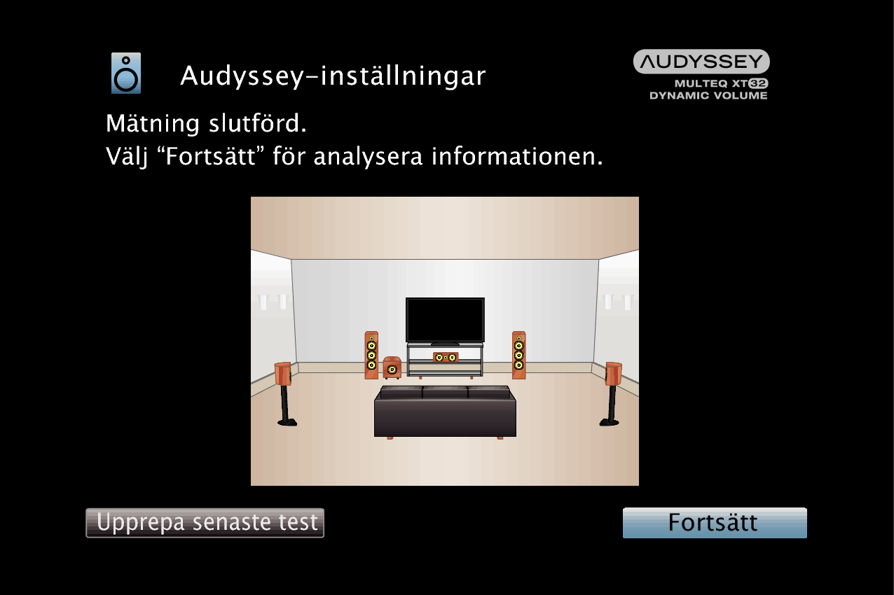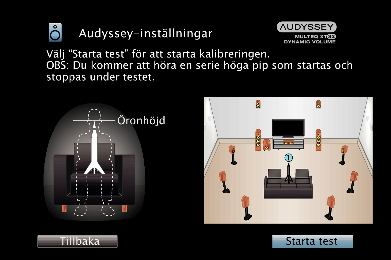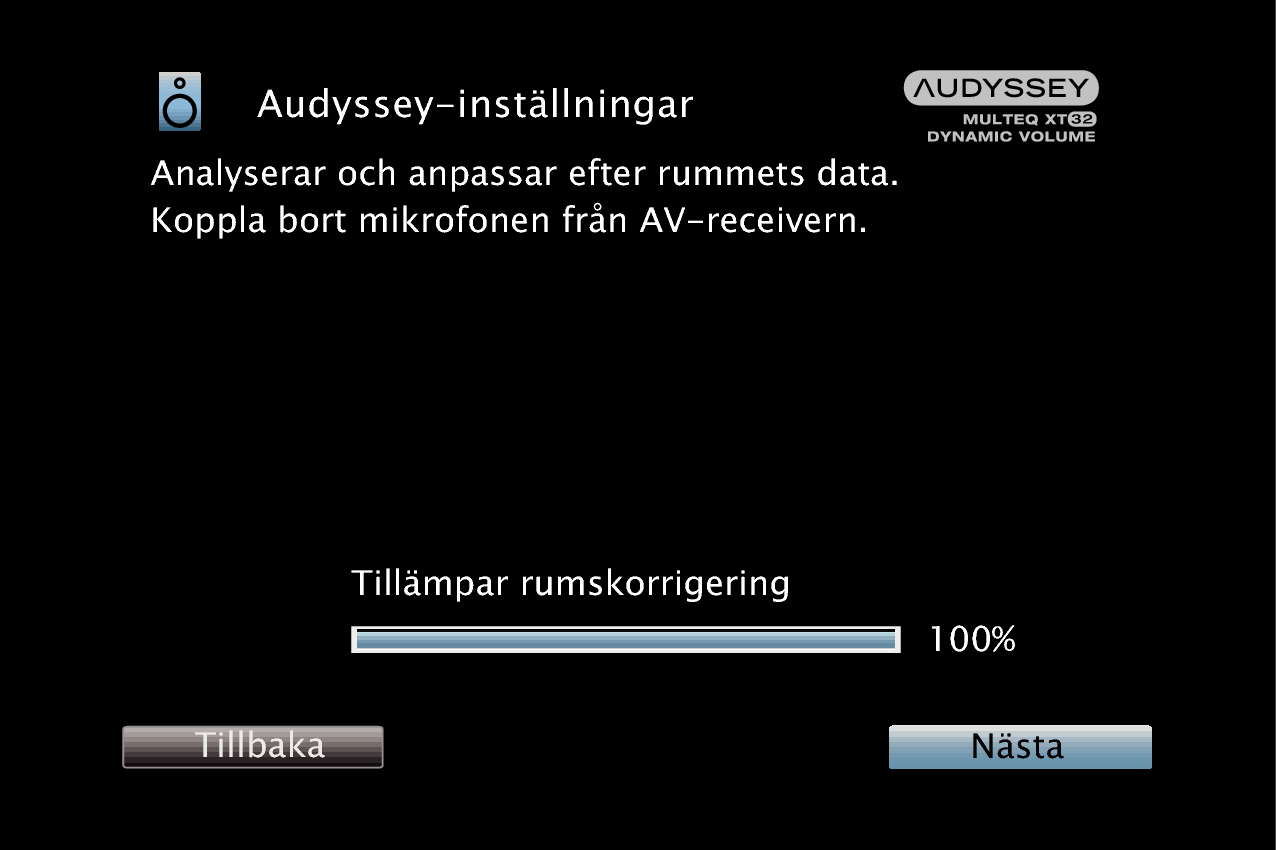 Ändra inte högtalaranslutning eller subwoofervolym efter Audyssey®-inställningarna. Om dessa ändras ska Audyssey®-inställningarna göras om för att konfigurera optimala equalizerinställningar.