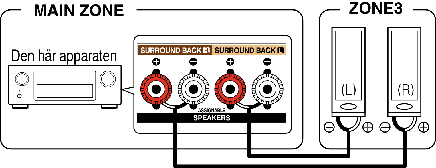 Ljudsignalerna från den här enhetens ljudutgång för ZONE2 och ZONE3 spelas upp i effektförstärkarna i ZONE2 och ZONE3.