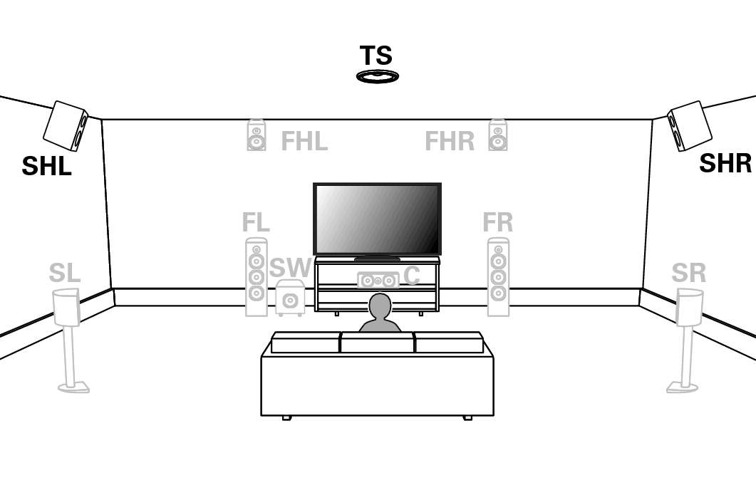 Platzieren Sie den TOP SURROUND-Lautsprecher direkt oberhalb der Haupthörposition und richten Sie ihn am Center-Kanal-Lautsprecher aus.