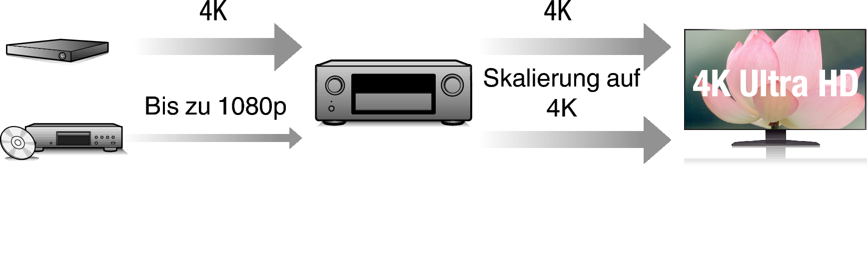 Dieses Gerät ist mit einer Skalierungsfunktion für 4K-Videodaten ausgestattet, sodass Sie analoge Videodaten oder SD-Video (Standard Definition) über HDMI mit 4K-Auflösung (3840 × 2160 Pixel) ausgeben können. Mit dieser Funktion können Sie das Gerät über ein einzelnes HDMI-Kabel an einen Fernseher anschließen und so hochauflösende Bilder für jede Videoquelle erzeugen.