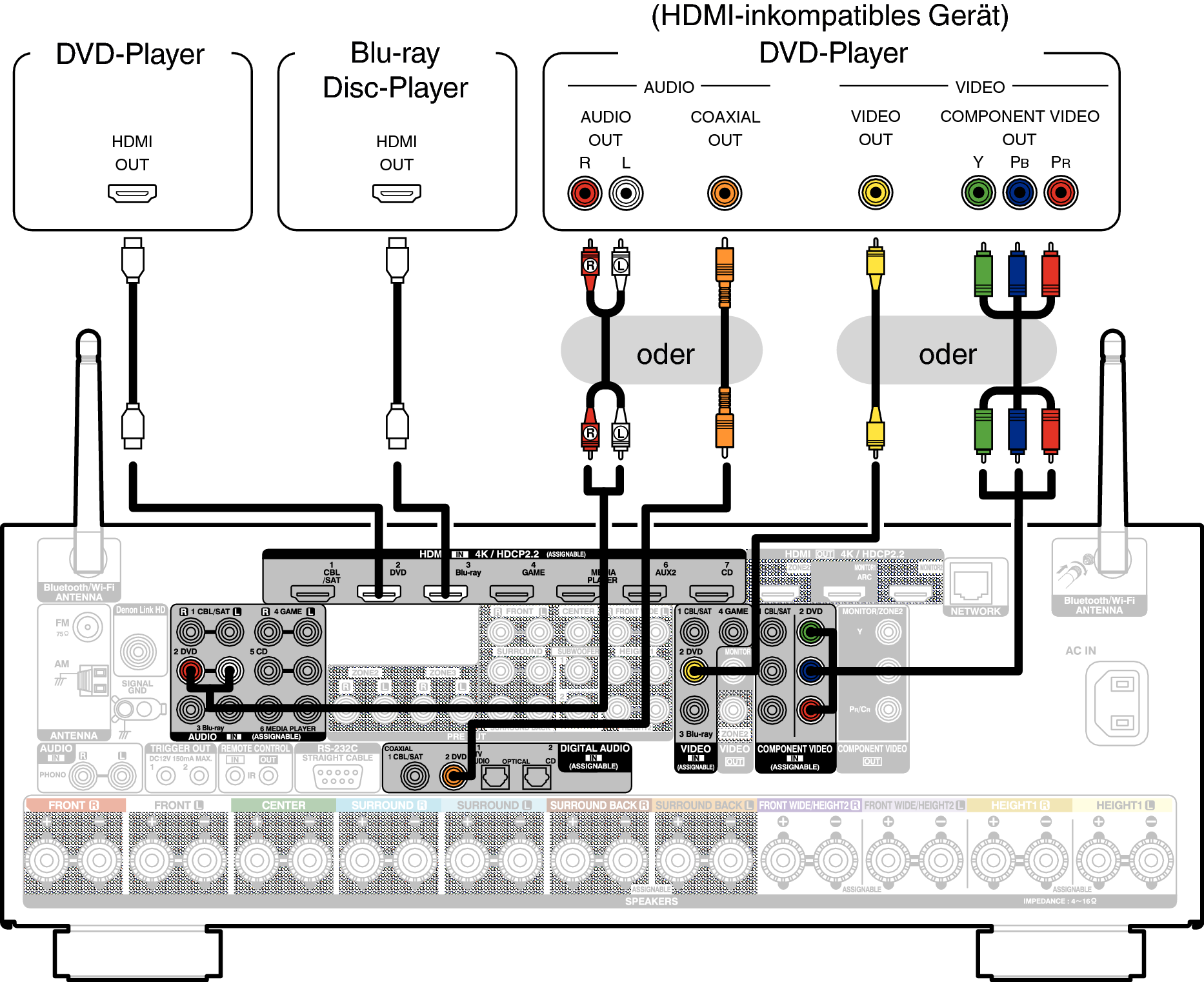 Wenn Sie einen mit Denon Link HD kompatiblen Blu-ray Disc-Player anschließen, finden Sie weitere Informationen unter “Anschließen eines mit der Denon Link HD-Funktion kompatiblen Blu-ray Disc-Players”Link.