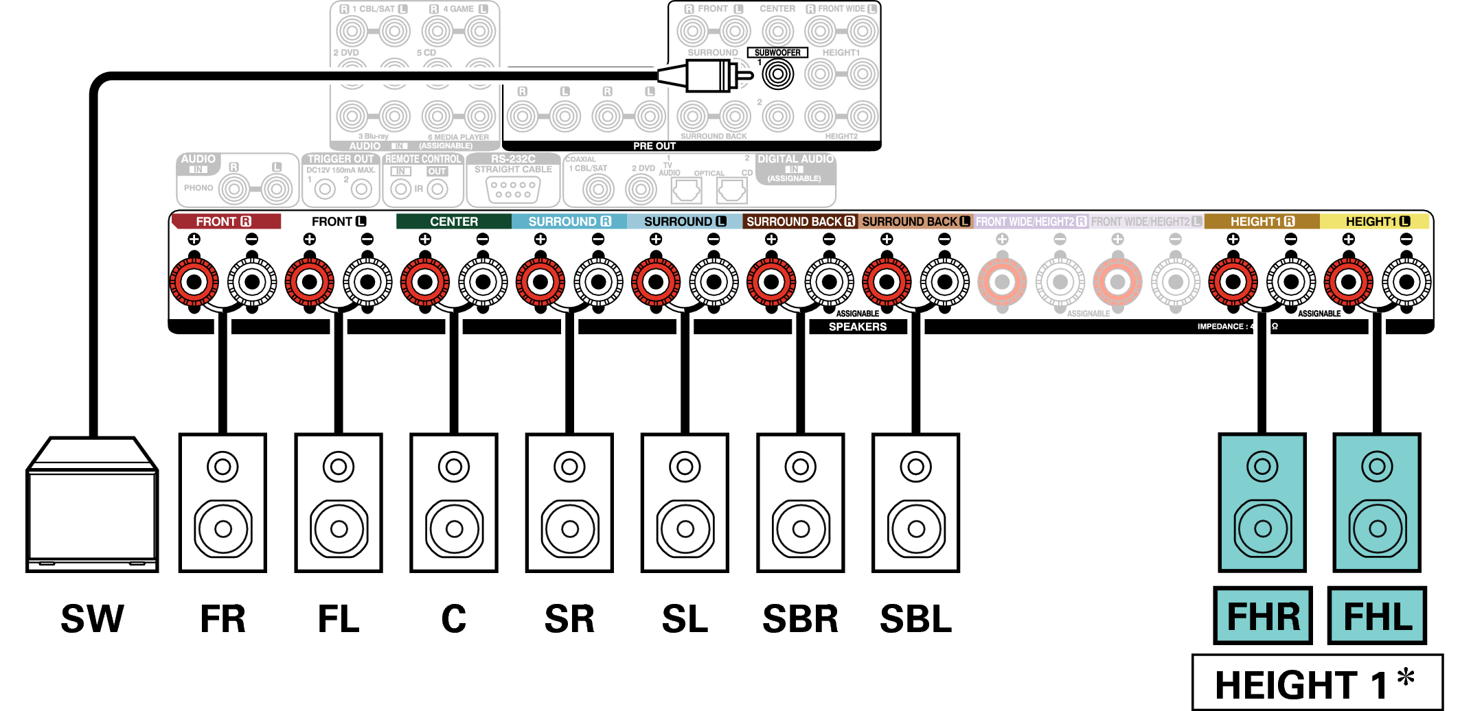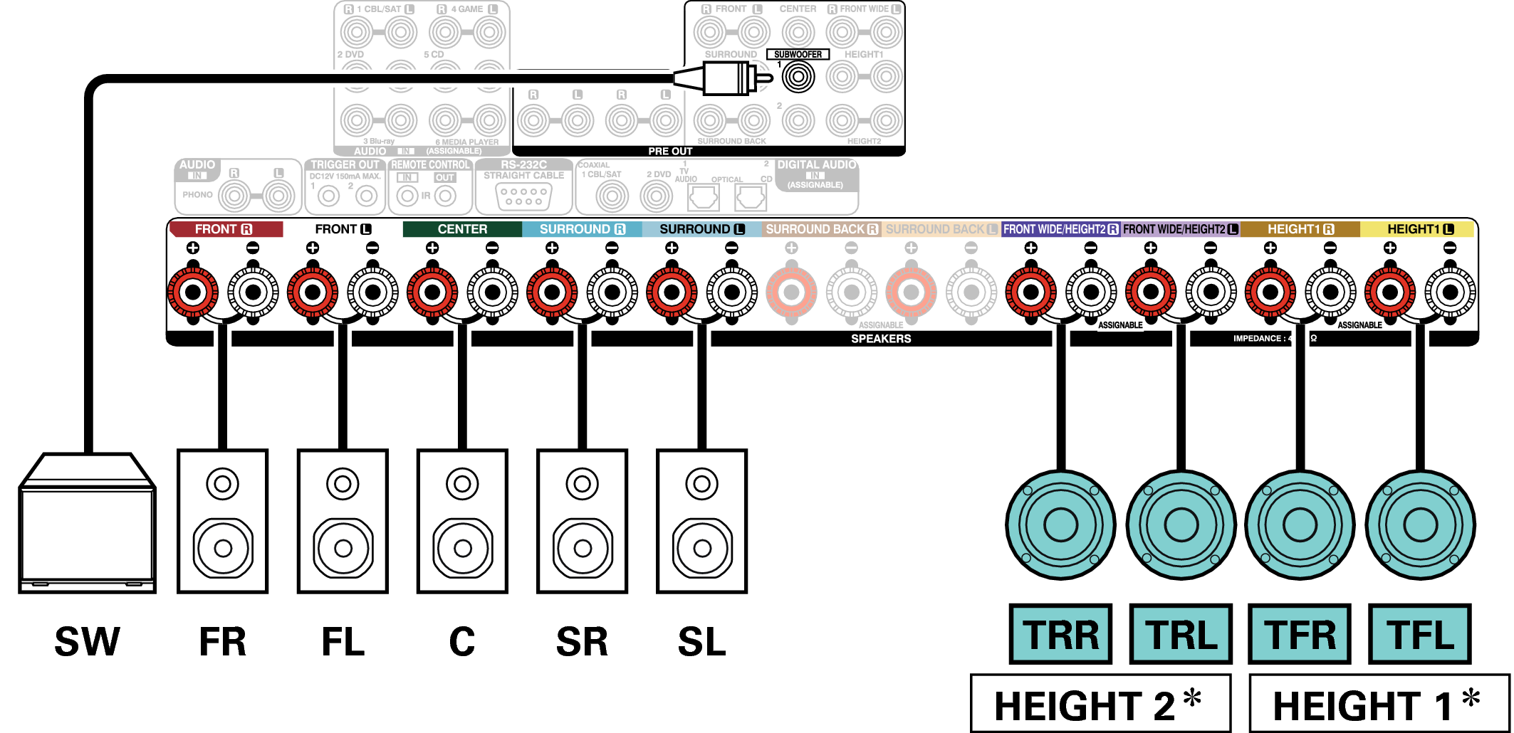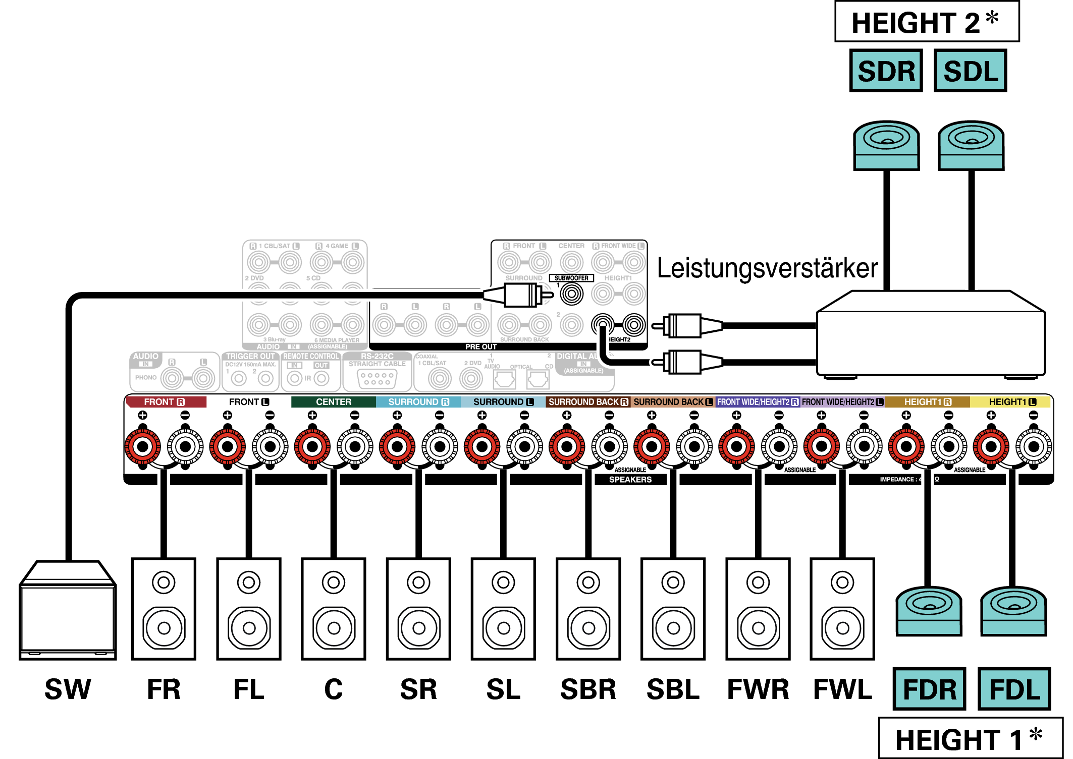 Anstelle der Fronthochtöner können die Rear-Height-Lautsprecher angeschlossen werden. Legen Sie in diesem Fall unter “Height” - “Layout” im Menü die anzuschließenden Hochtöner (Height-Lautsprecher) fest. Link