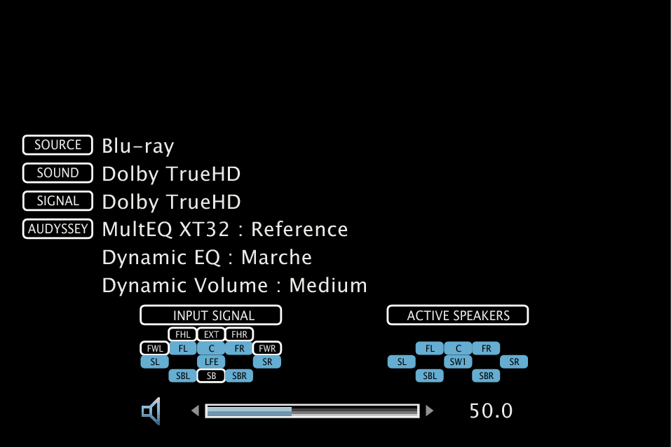 Appuyez sur INFO sur la télécommande pour afficher le nom de la source actuelle, le volume, le nom du mode audio et d’autres informations dans la partie inférieure de l’écran.
