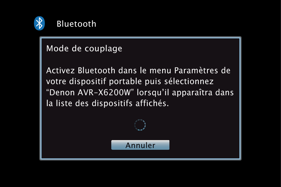 Lors de la prochaine commutation de la source d’entrée sur le Bluetooth, cet appareil se connectera automatiquement au dernier périphérique Bluetooth connecté.