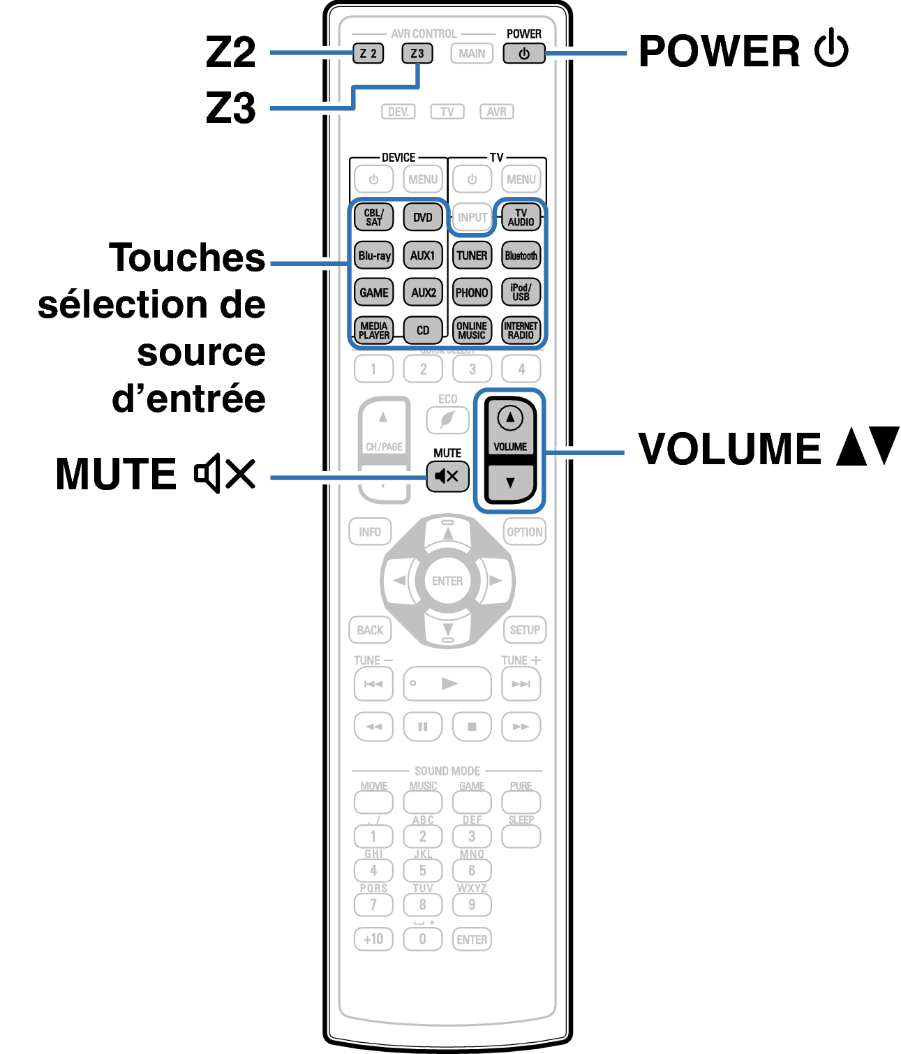 l est possible de mettre sous tension et hors tension la ZONE2 ou ZONE3 en appuyant sur ZONE2 ON/OFF ou ZONE3 ON/OFF directement sur l’appareil.