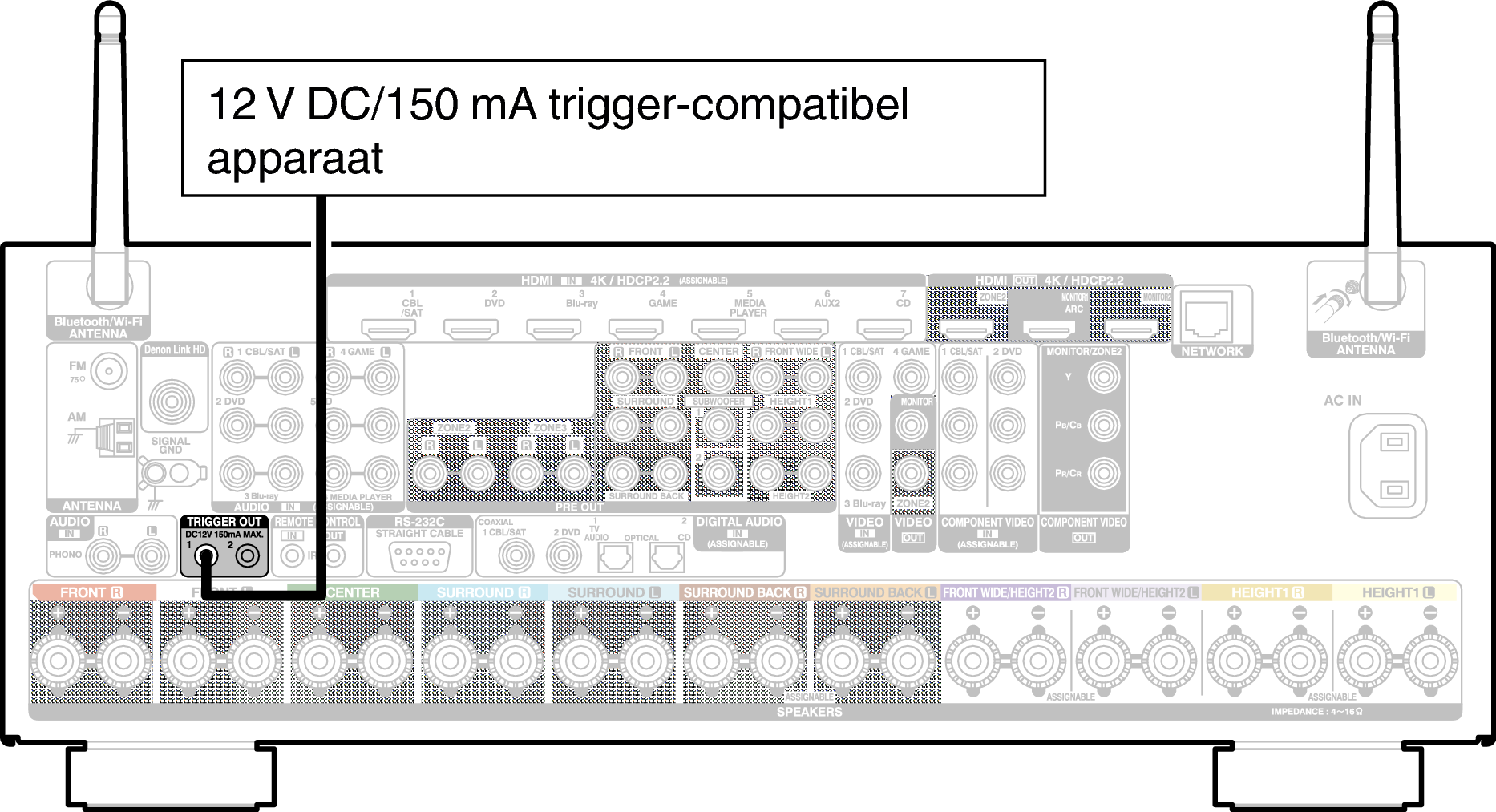 De TRIGGER OUT-aansluiting stuurt een elektrisch signaal uit van maximaal 12 V DC/150 mA.