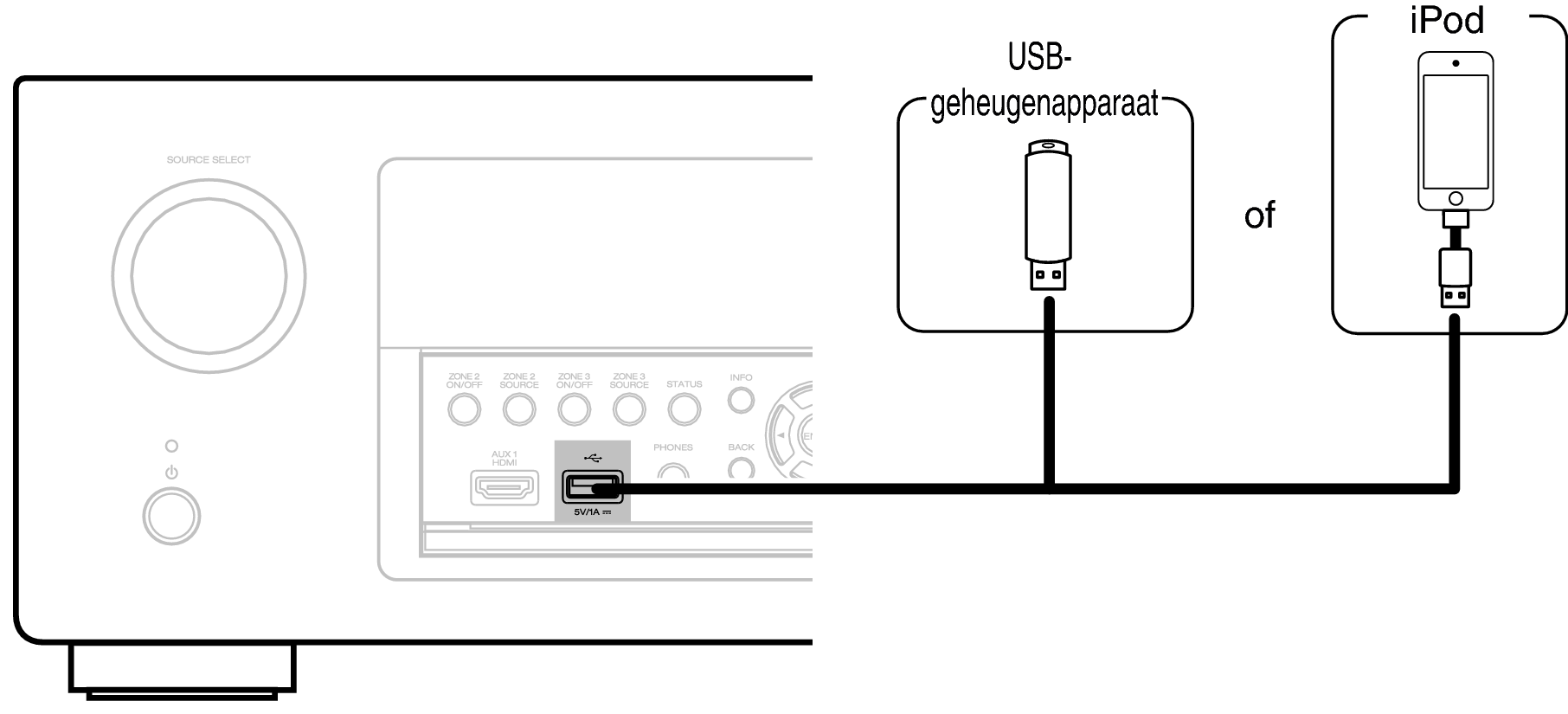 Denon kan niet garanderen dat alle USB-geheugenapparaten zullen werken of stroom zullen krijgen. Wanneer u een draagbare USB harde schijf (HDD) gebruikt die met een voedingsadapter is geleverd, moet u de bijgeleverde voedingsadapter van dat apparaat gebruiken.