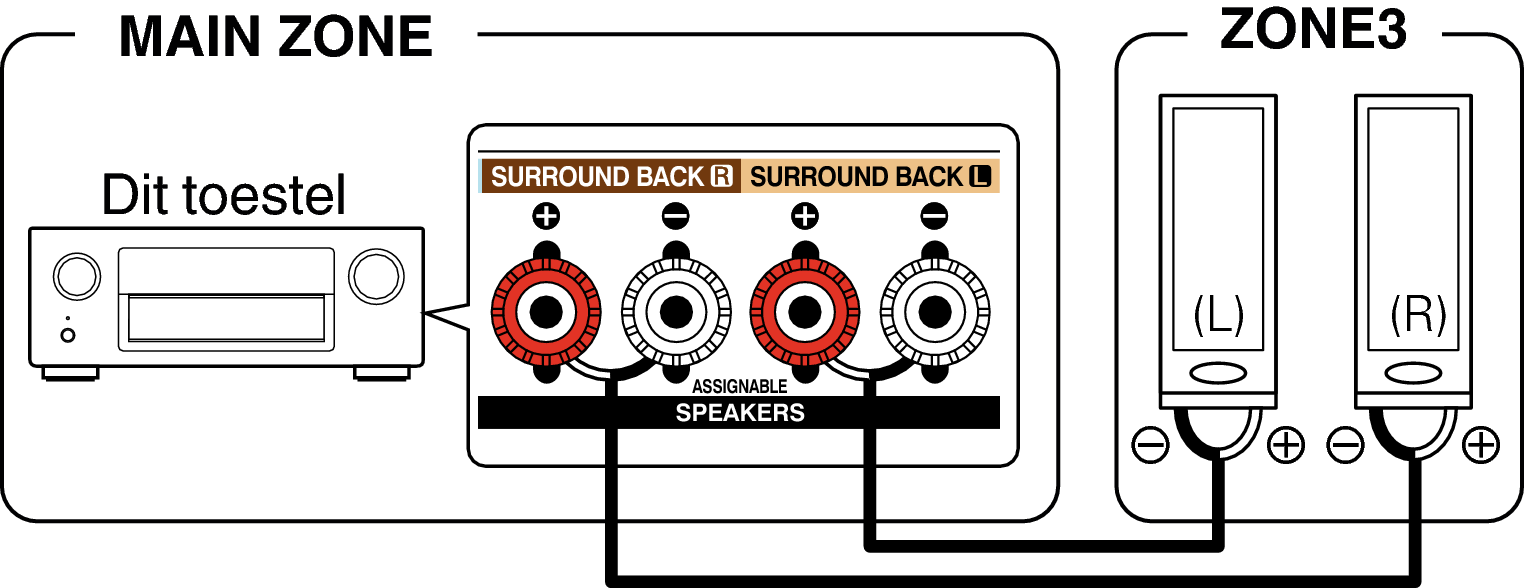 De audiosignalen van de ZONE2- en ZONE3-audio-uitgangen van dit toestel worden uitgevoerd naar de ZONE2- en ZONE3-versterkers en afgespeeld via deze versterkers.