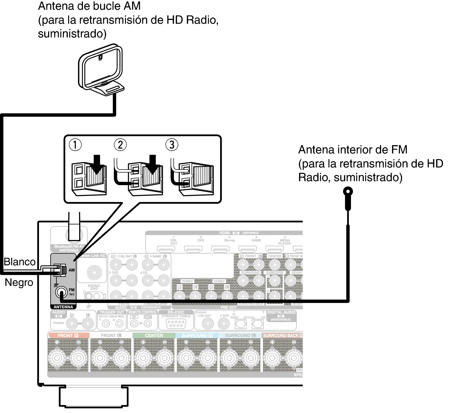 Después de conectar la antena y recibir una señal de radio, utilice cinta adhesiva para fijar la antena en una posición en la que el nivel de ruido sea mínimo. (Audición de emisoras HD Radio™enlace)