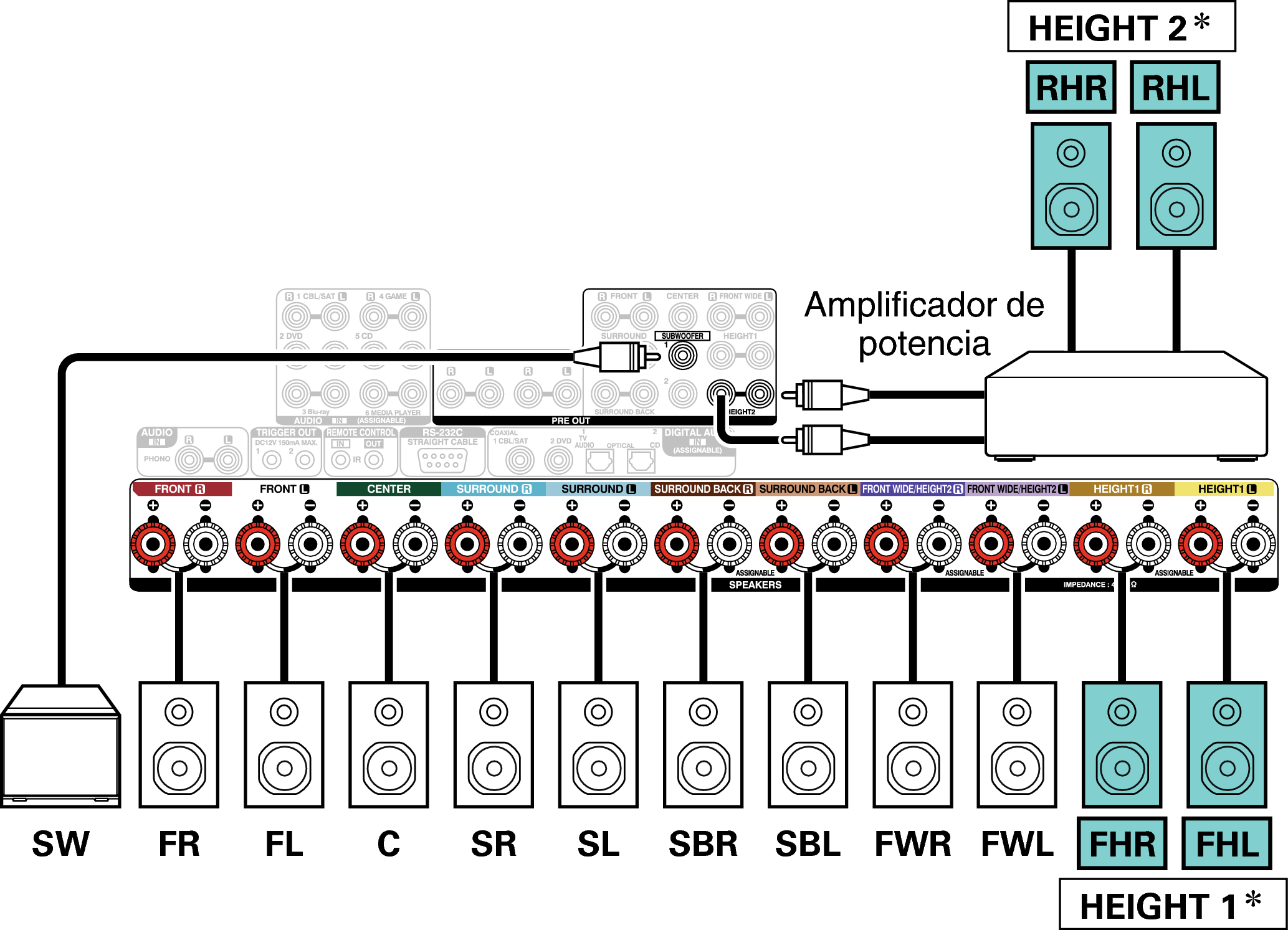 Los altavoces de altura, altavoces de techo y altavoces Dolby Atmos Enabled se pueden conectar a los terminales de altavoz HEIGHT1. Establezca el altavoz que se vaya a conectar mediante la opción “Altura” - “Distribución” del menú. enlace