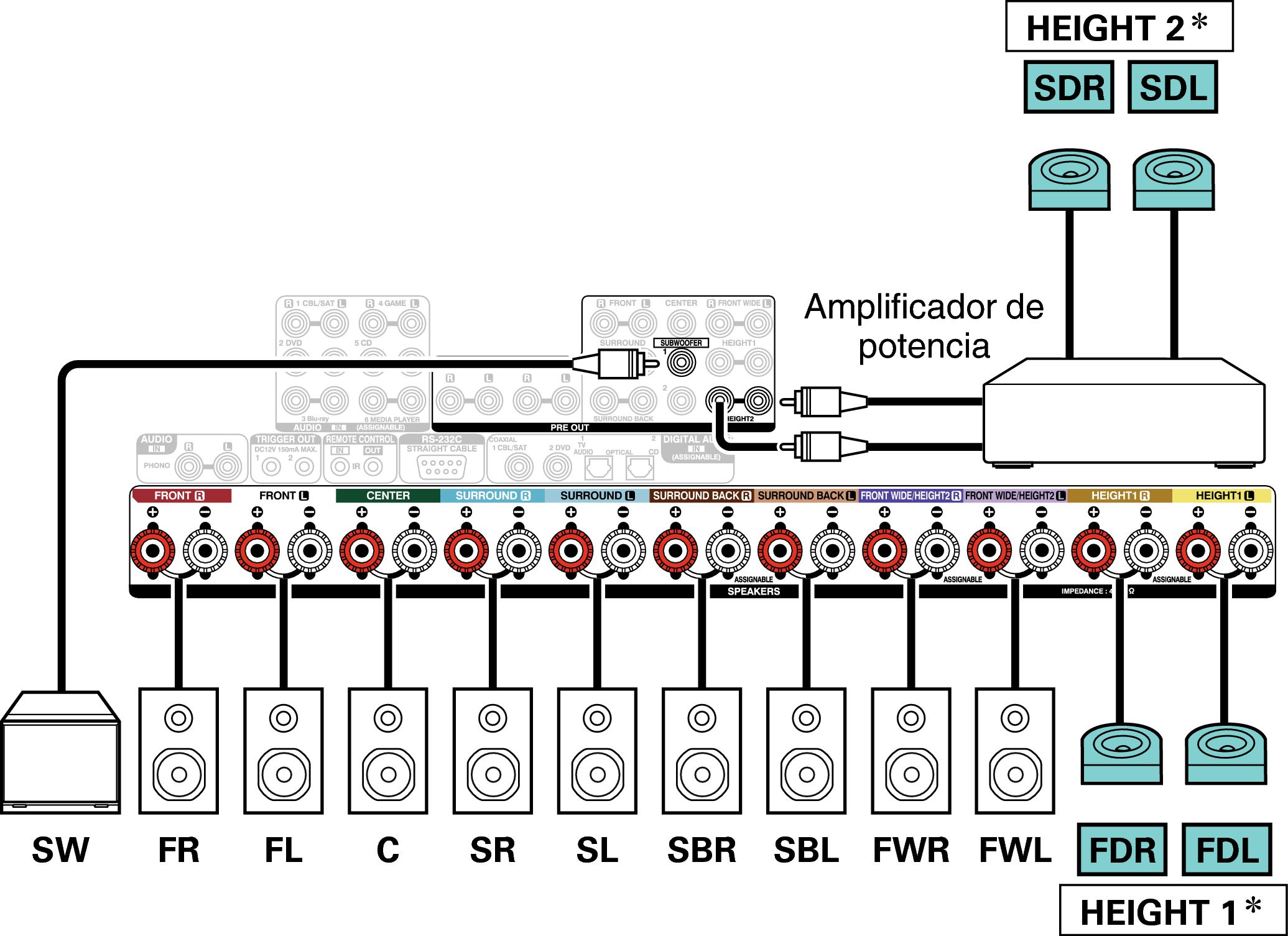 Ejemplo de conexión cuando se utilizan altavoces surround trasero y ancho delantero