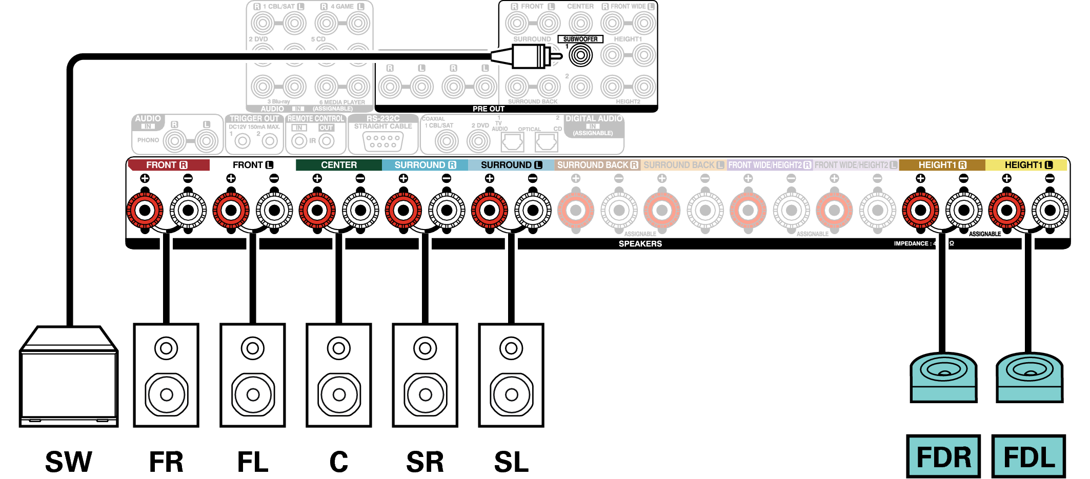 Ejemplo de conexión cuando se utiliza un juego de altavoces de altura