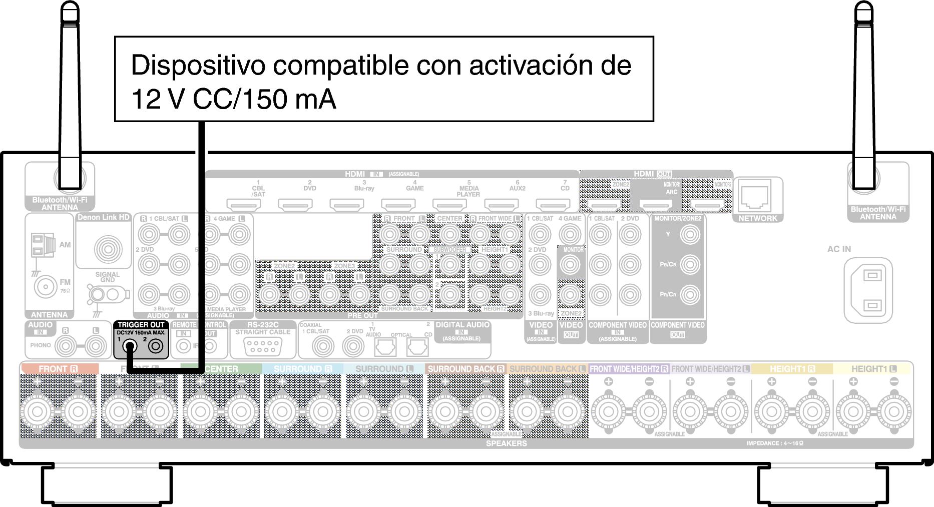 El conector TRIGGER OUT emite una señal eléctrica de 12 V CC/150 mA como máximo.