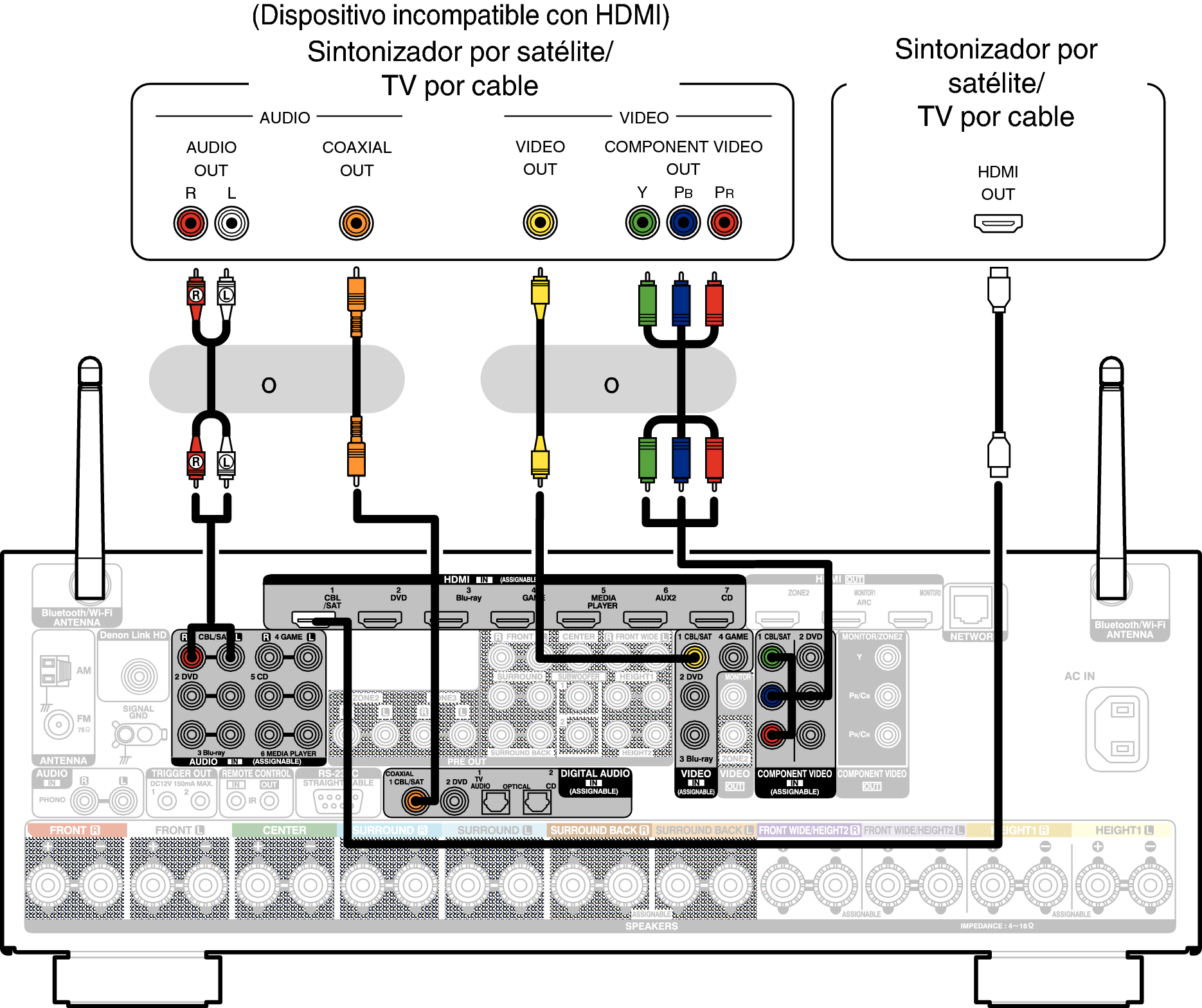 En esta explicación se incluye la conexión con un sintonizador de TV por satelite/por cable como ejemplo.
