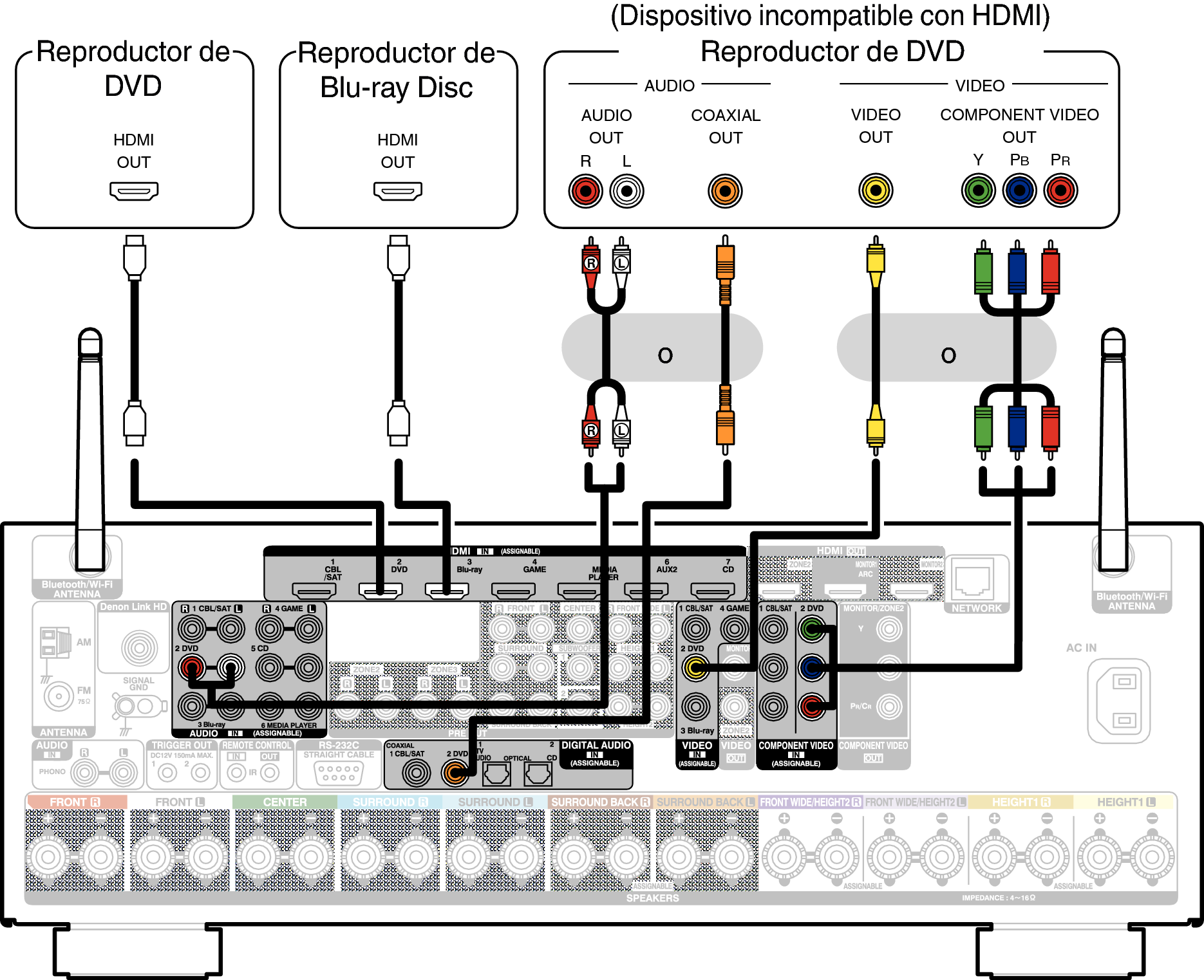 En esta explicación se incluye la conexión con un reproductor de DVD o reproductor de Blu-ray Disc como ejemplo.