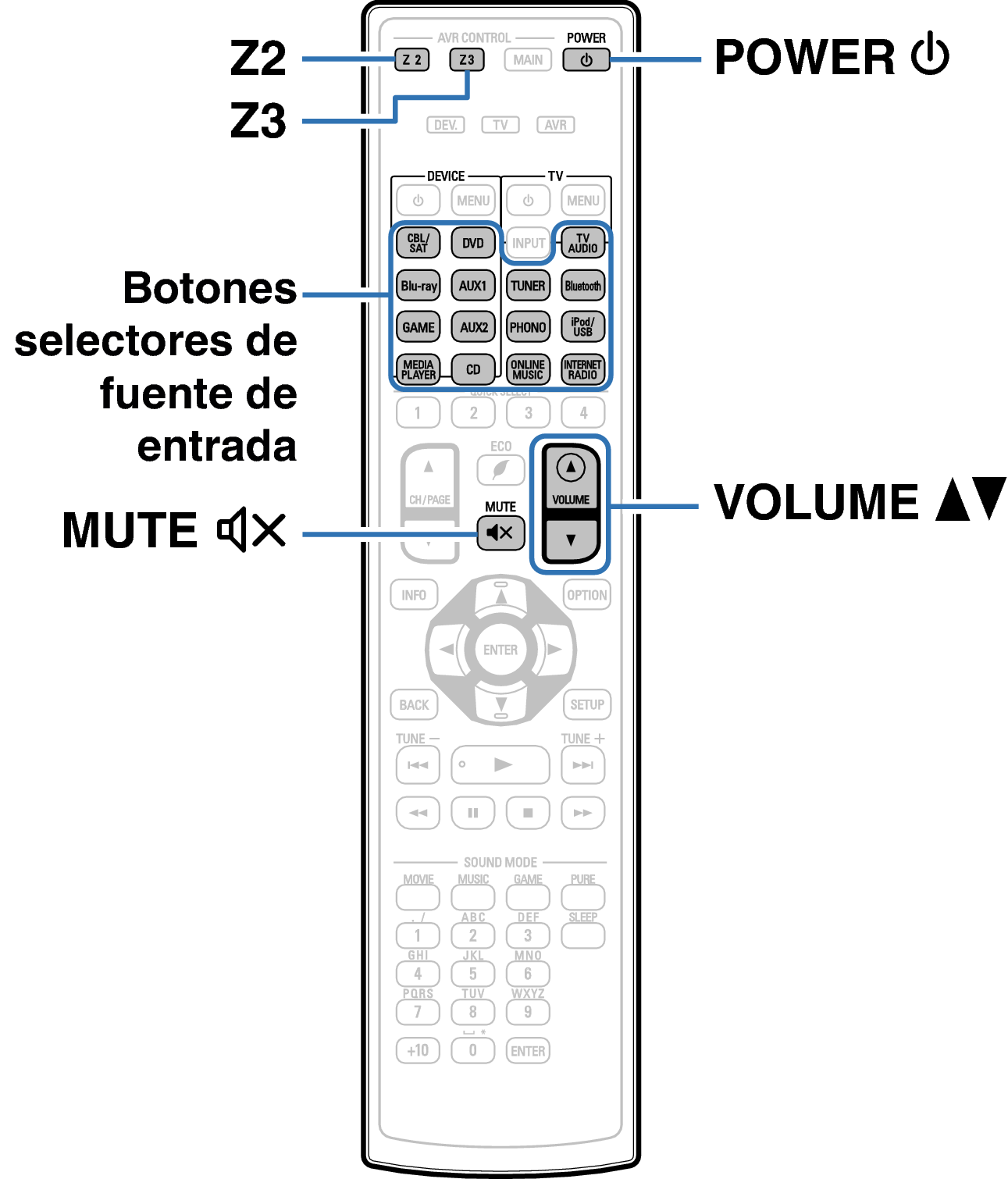 Para realizar una operación con la unidad principal, pulse ZONE2 SOURCE o ZONE3 SOURCE. Cada vez que pulse ZONE2 SOURCE o ZONE3 SOURCE, la fuente de entrada cambia.