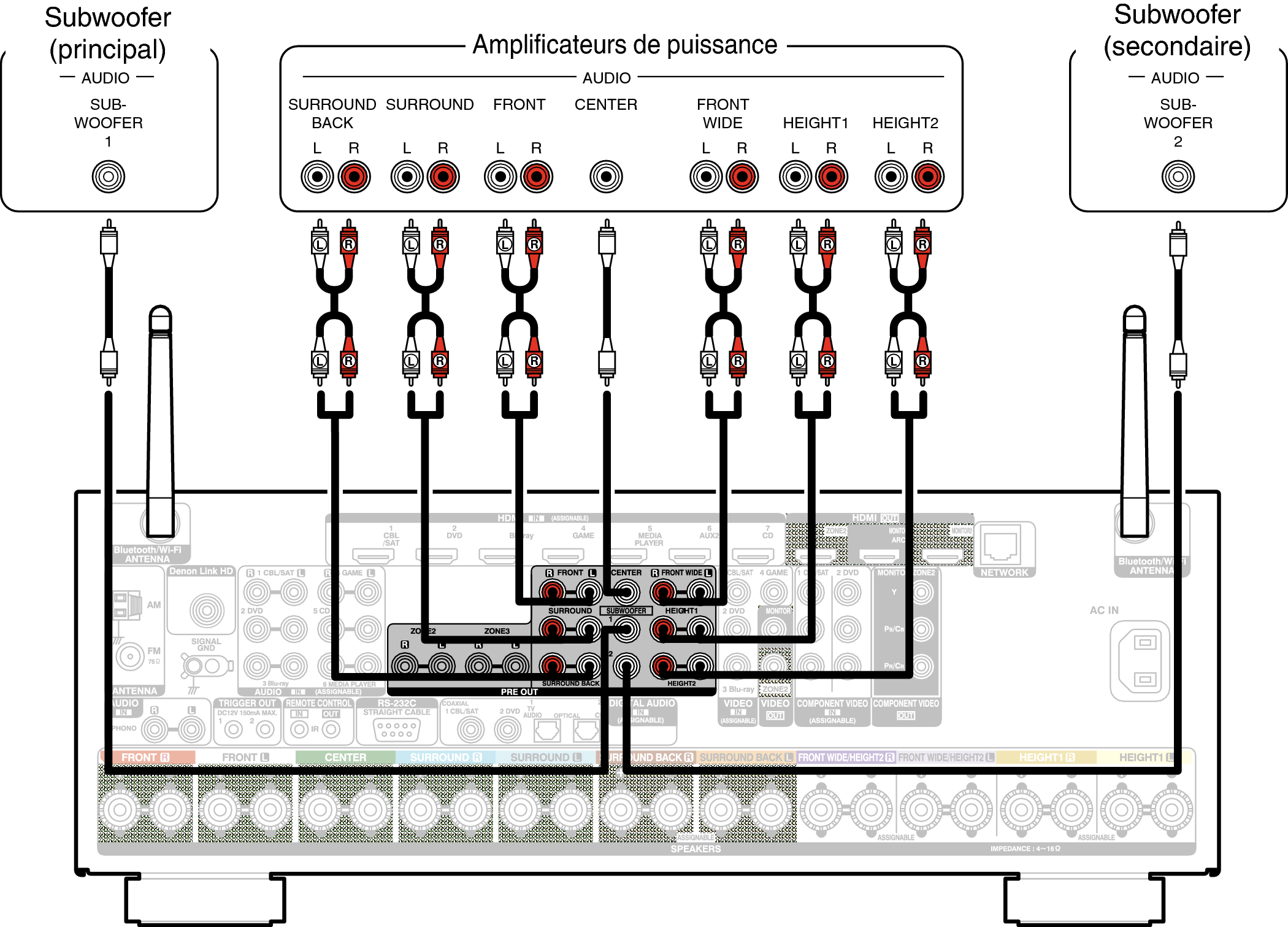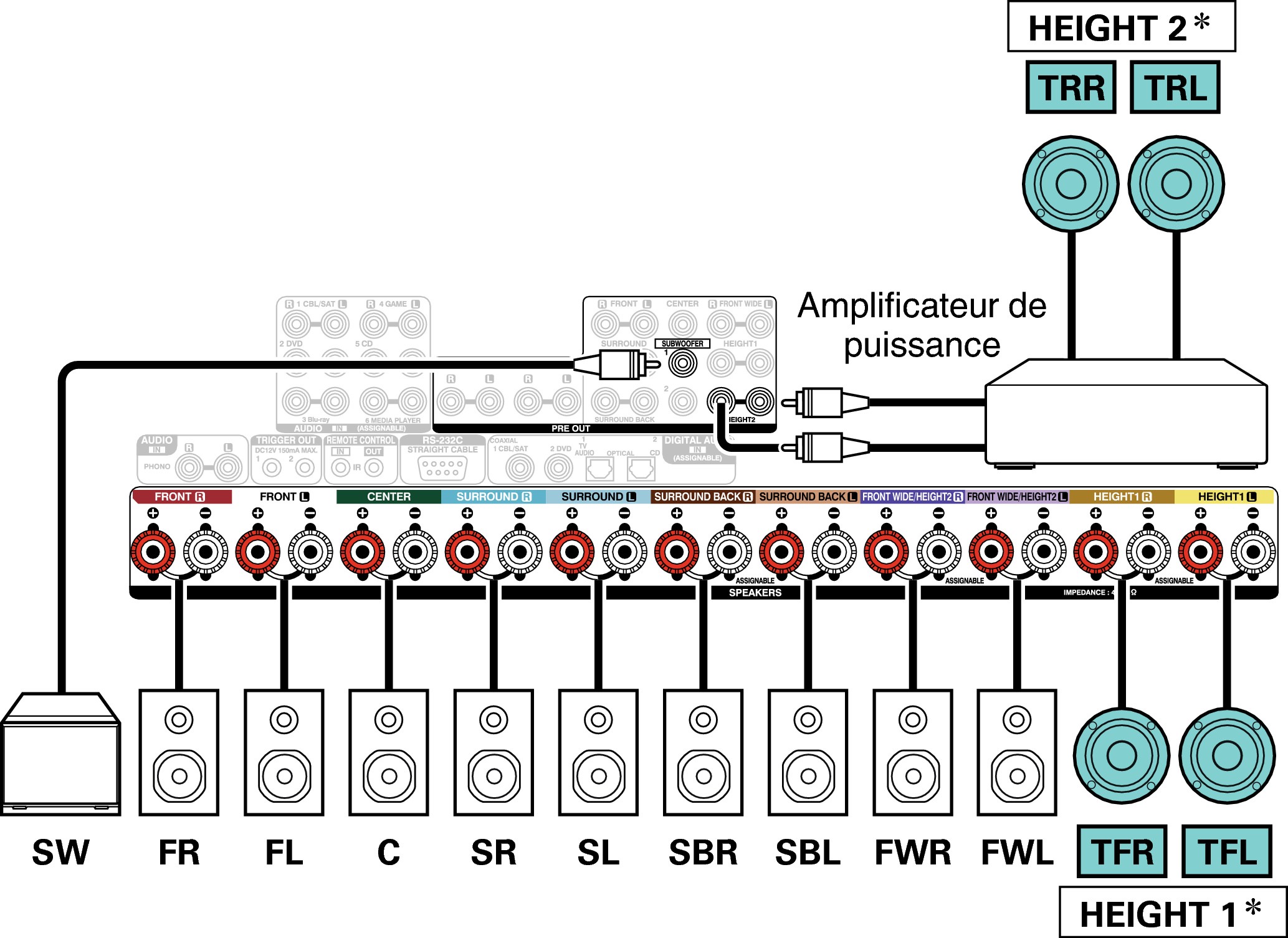 Exemple de connexion avec utilisation d’enceintes surround arrière et larges avant