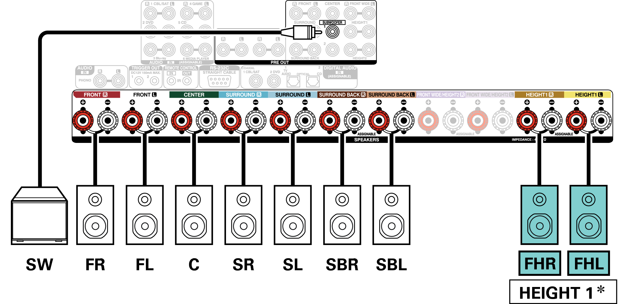 Les enceintes hautes, les enceintes au plafond et les enceintes Dolby Atmos Enabled peuvent être connectées sur les bornes d’enceinte HEIGHT1. Réglez les enceintes à connecter depuis “Hauteur” - “Agencement” dans le menu. lien