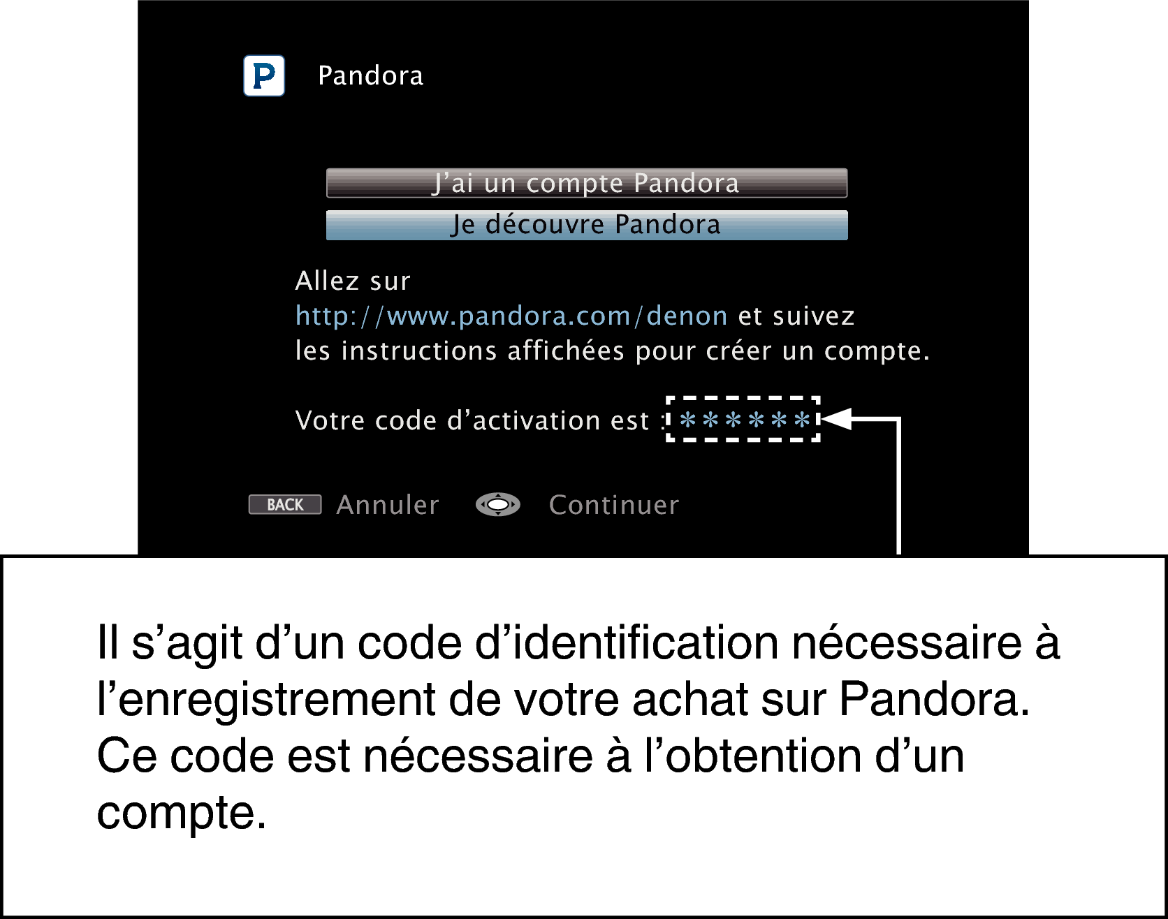 Si vous ne disposez pas de compte Pandora, appuyez sur ENTER pour sélectionner “Je découvre Pandora”. L’URL de Pandora et le code d’activation s’affichent. Accédez à la page Web de Pandora à partir de votre ordinateur et enregistrez le code d’activation affiché et les informations du compte. Ensuite, appuyez sur ENTER.