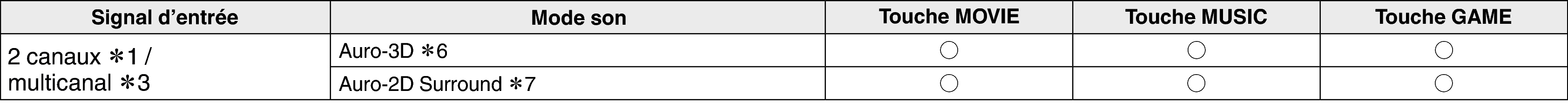 Le mode sonore qui peut être sélectionné varie selon le format audio du signal d’entrée et le nombre de canaux. Pour plus de détails, reportez-vous à Types de signaux d’entrée et modes audio correspondantslien.
