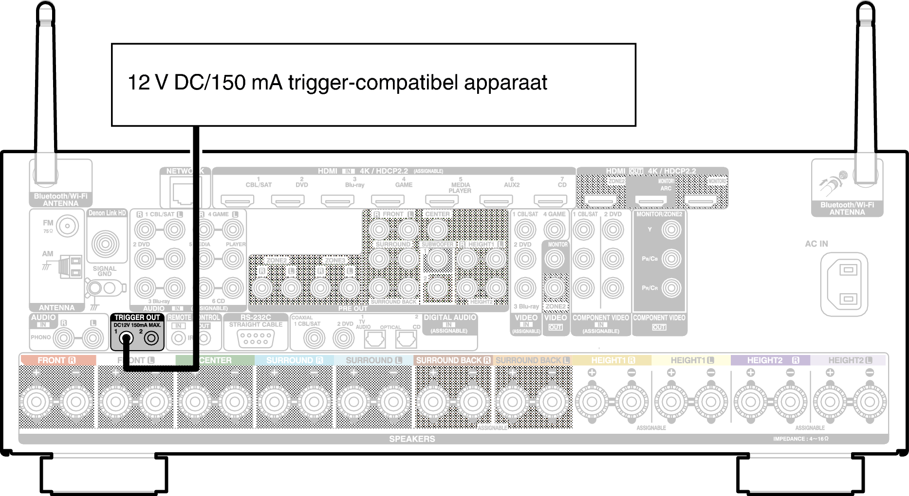 Indien het toelaatbare trigger-ingangsniveau voor het aangesloten apparaat hoger is dan 12 V DC/150 mA, of indien het is kortgesloten, kan de TRIGGER OUT-aansluiting niet worden gebruikt. In dit geval dient u het toestel uit te zetten en het af te koppelen.