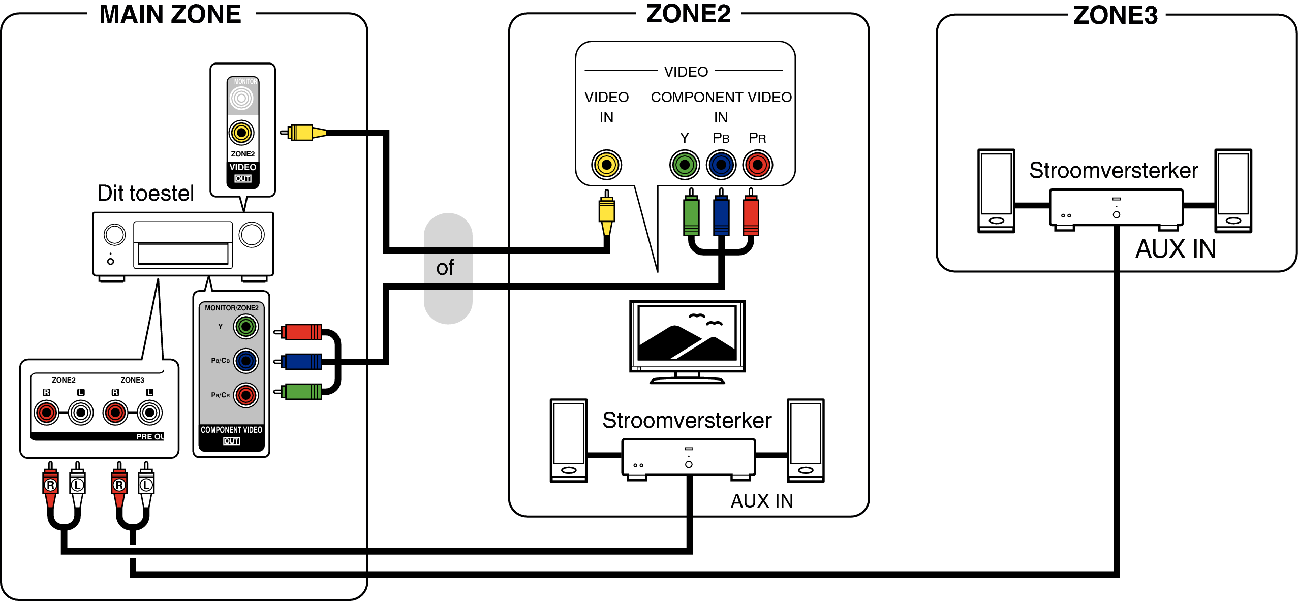 De audiosignalen van de ZONE2- en ZONE3-audio-uitgangen van dit toestel worden uitgevoerd naar de ZONE2- en ZONE3-versterkers en afgespeeld via deze versterkers.