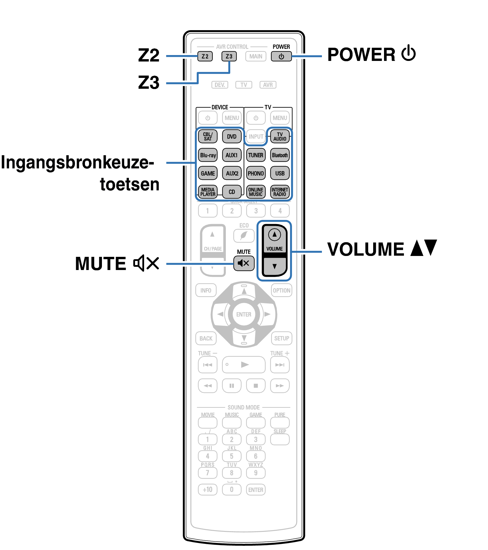 Voor het uitvoeren van een bediening met het hoofdtoestel, moet u herhaaldelijk op ZONE2 SOURCE of ZONE3 SOURCE drukken. Telkens wanneer u op ZONE2 SOURCE of ZONE3 SOURCE drukt, verandert de ingangsbron.