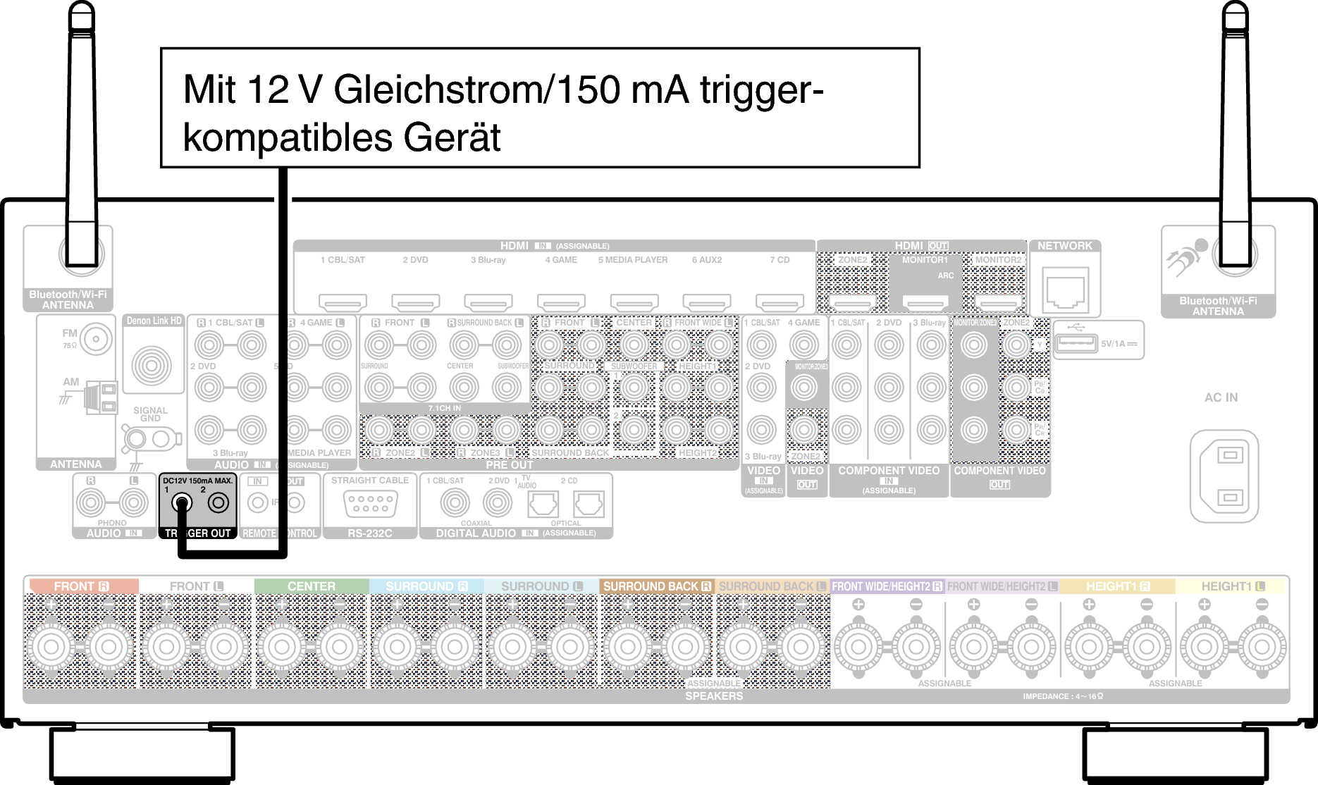 Wenn ein Gerät mit TRIGGER IN-Buchse angeschlossen ist, lässt sich die Einschalt-/Standby-Funktion des jeweiligen Geräts über dieses Gerät durch die Gerätekopplung betätigen.