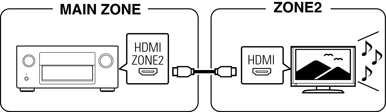 Wenn ein Fernseher an den HDMI ZONE2 OUT-Anschluss angeschlossen wurde, können Sie Video oder Audio von dem an den HDMI 1 – 7 IN-Anschluss angeschlossenen Gerät in ZONE2 wiedergeben (HDMI ZONE2-Funktion).