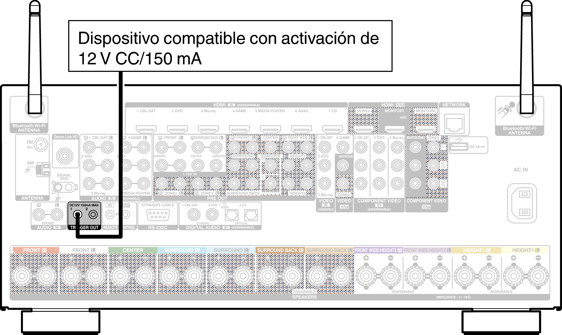 Si el nivel de entrada de activación admisible del dispositivo conectado es superior a 12 V CC/150 mA, o se ha cortocircuitado, no será posible utilizar el conector TRIGGER OUT. En ese caso, apague la unidad y desconéctela.