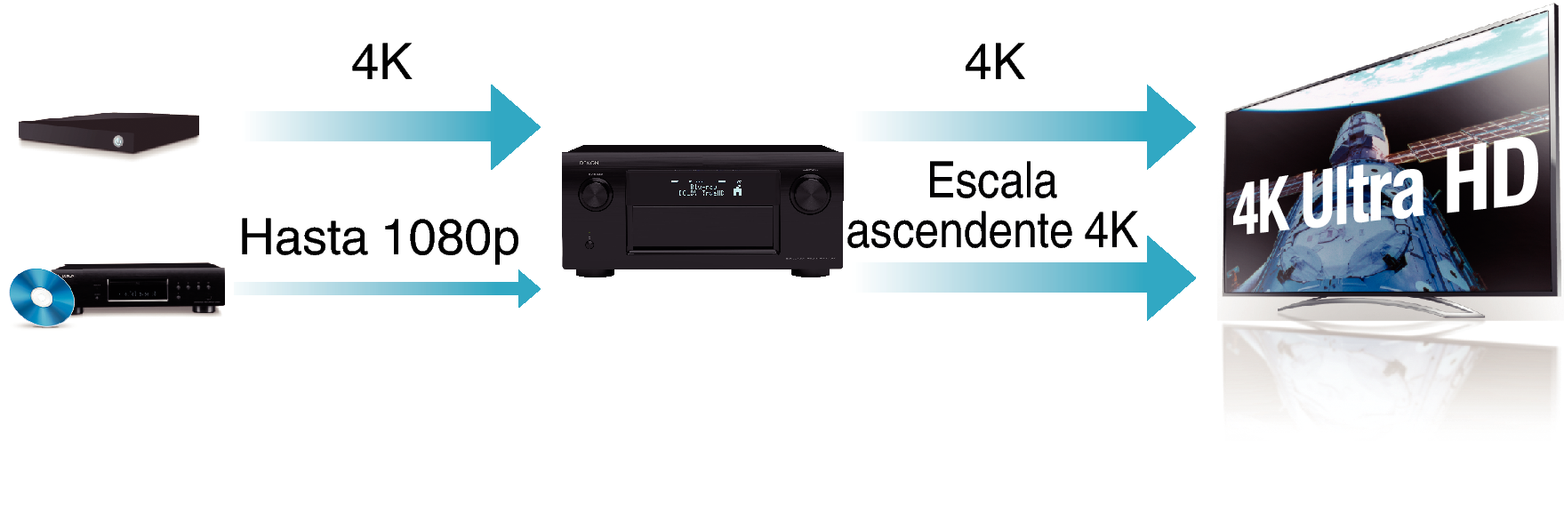 Esta unidad está equipada con una función de escalado de vídeo de 4K que permite la salida de vídeo analógico o SD (definición estándar) a través de HDMI a una resolución de 4K (3840 × 2160 píxeles). Esta función habilita la conexión del dispositivo a una TV utilizando un solo cable HDMI y produce imágenes en alta definición para cualquier fuente de vídeo.