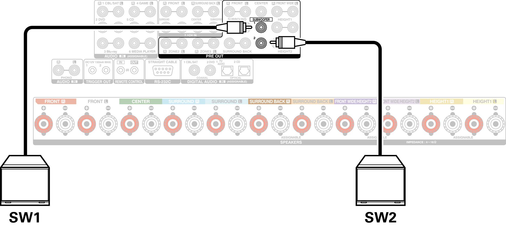 Utilisez un câble adapté pour connecter le subwoofer. Il est possible de raccorder deux subwoofers à cet appareil.